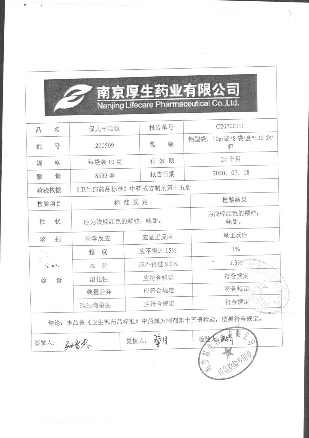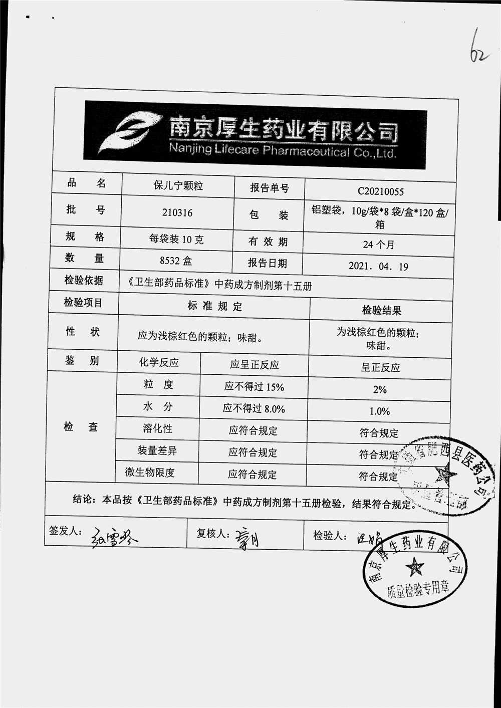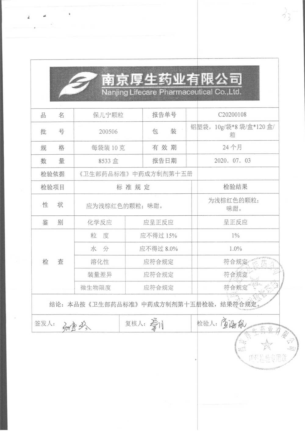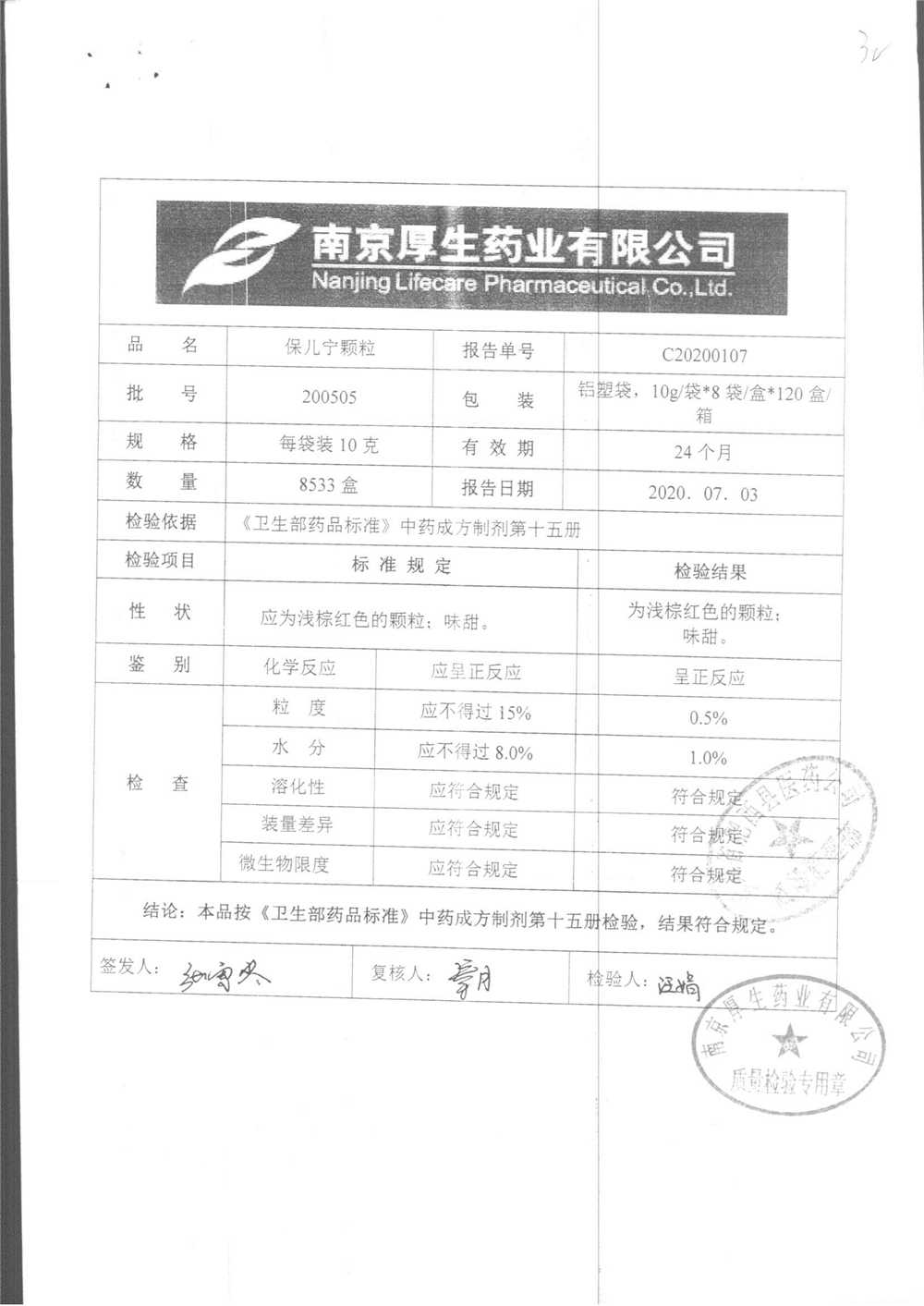 | 保儿宁颗粒 | 10g | 200506 | 查看详情 |
