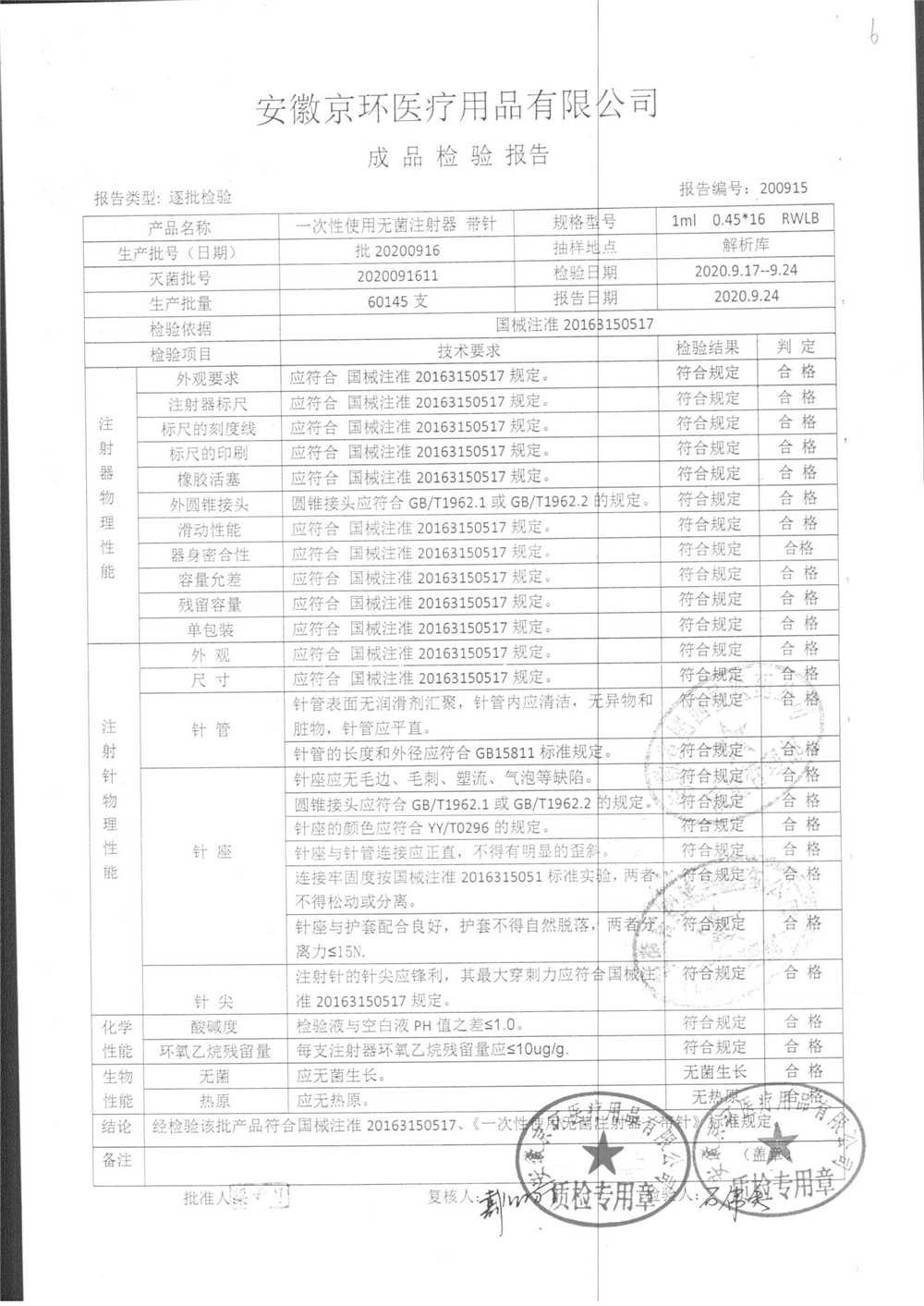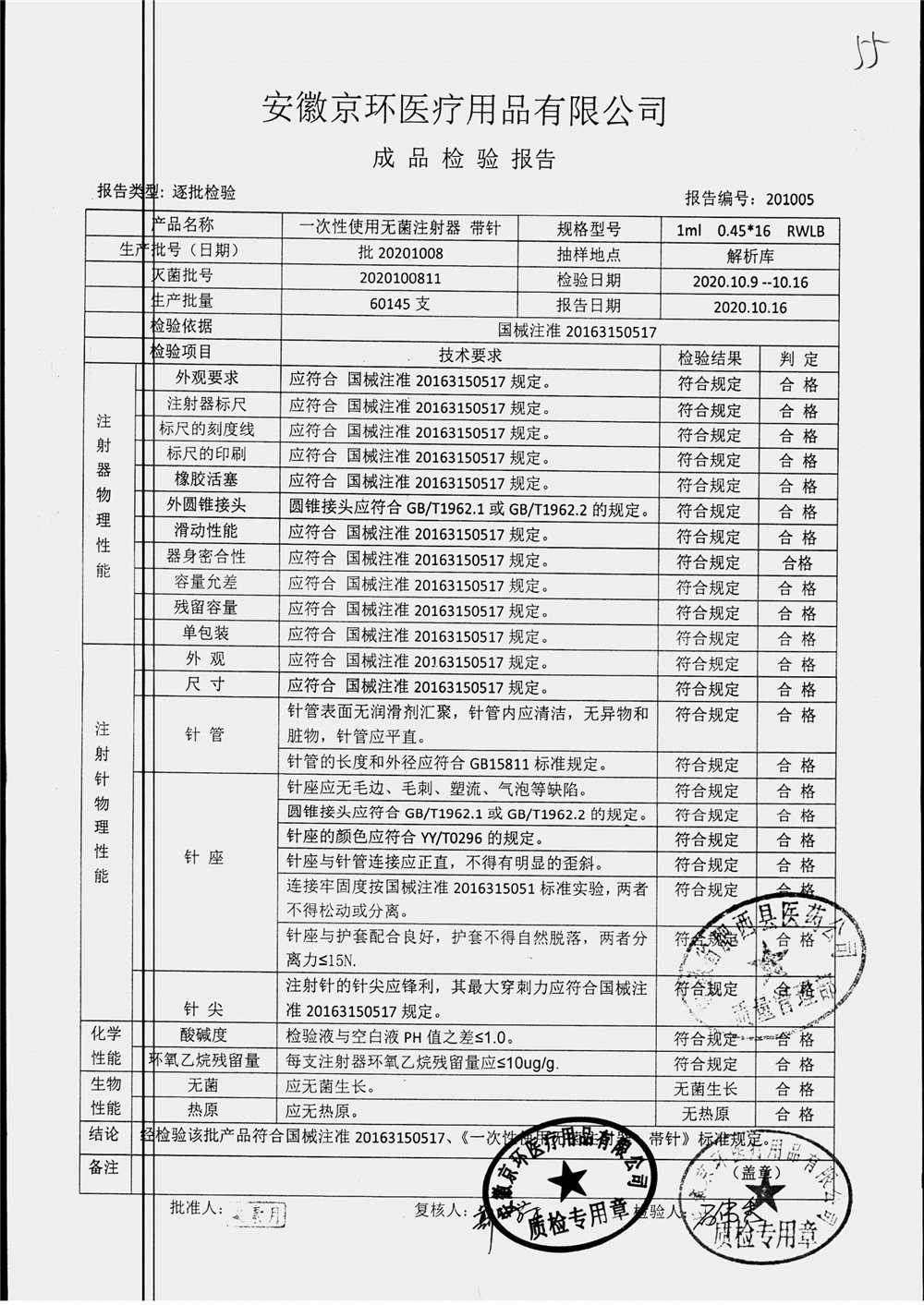 | 一次性使用无菌注射器 带针 | 1ml 0.45*16 | 20201008 | 查看详情 |