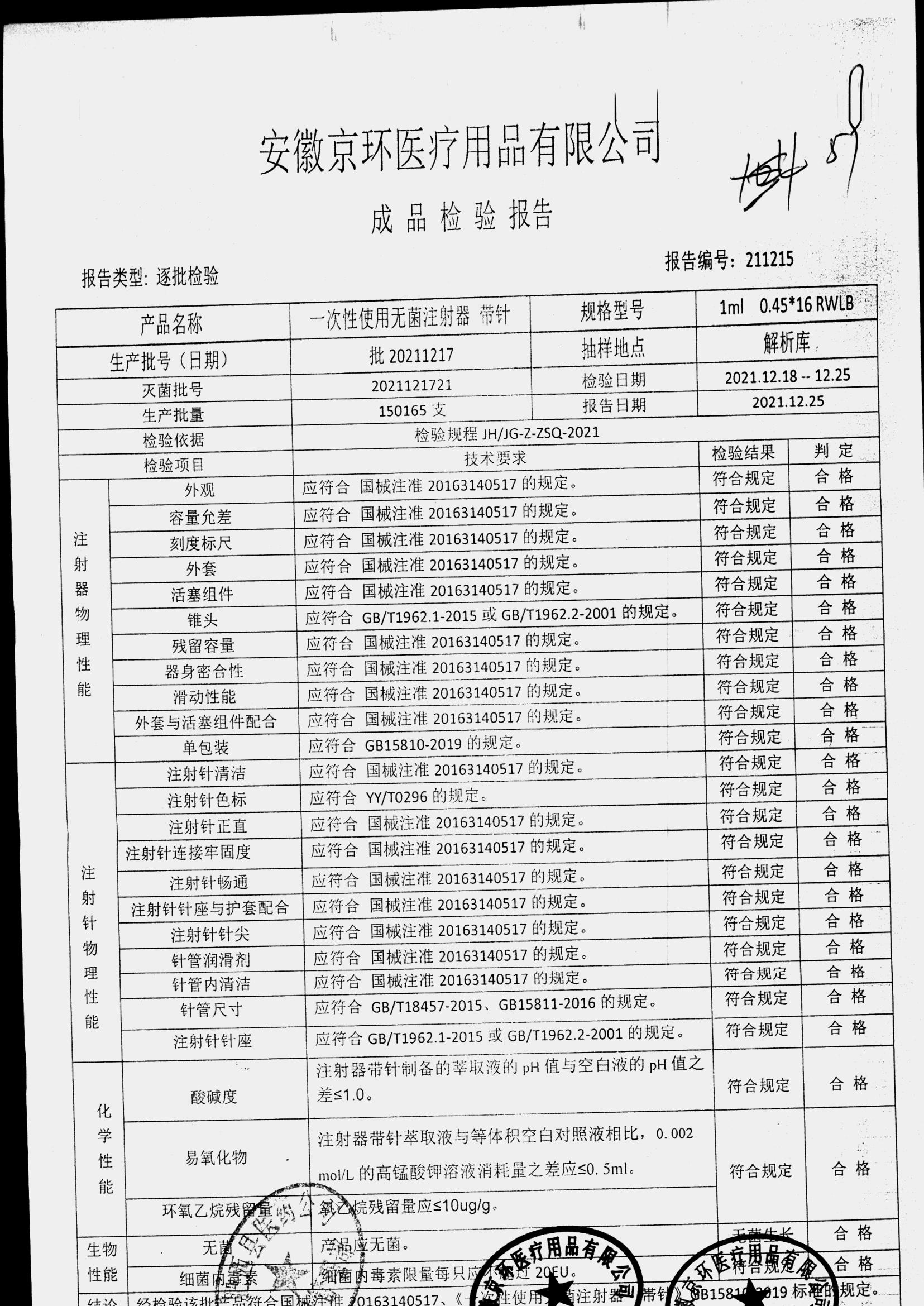 | 一次性使用无菌注射器 带针 | 1ml 0.45*16 | 批20211217 | 查看详情 |