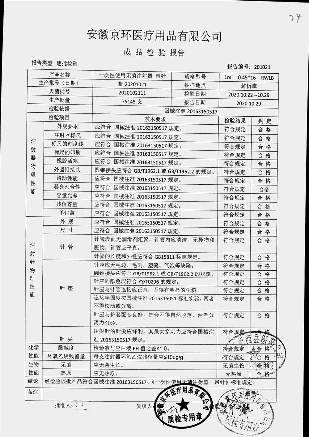 | 一次性使用无菌注射器 带针 | 1ml 0.45*16 | 20201021 | 查看详情 |