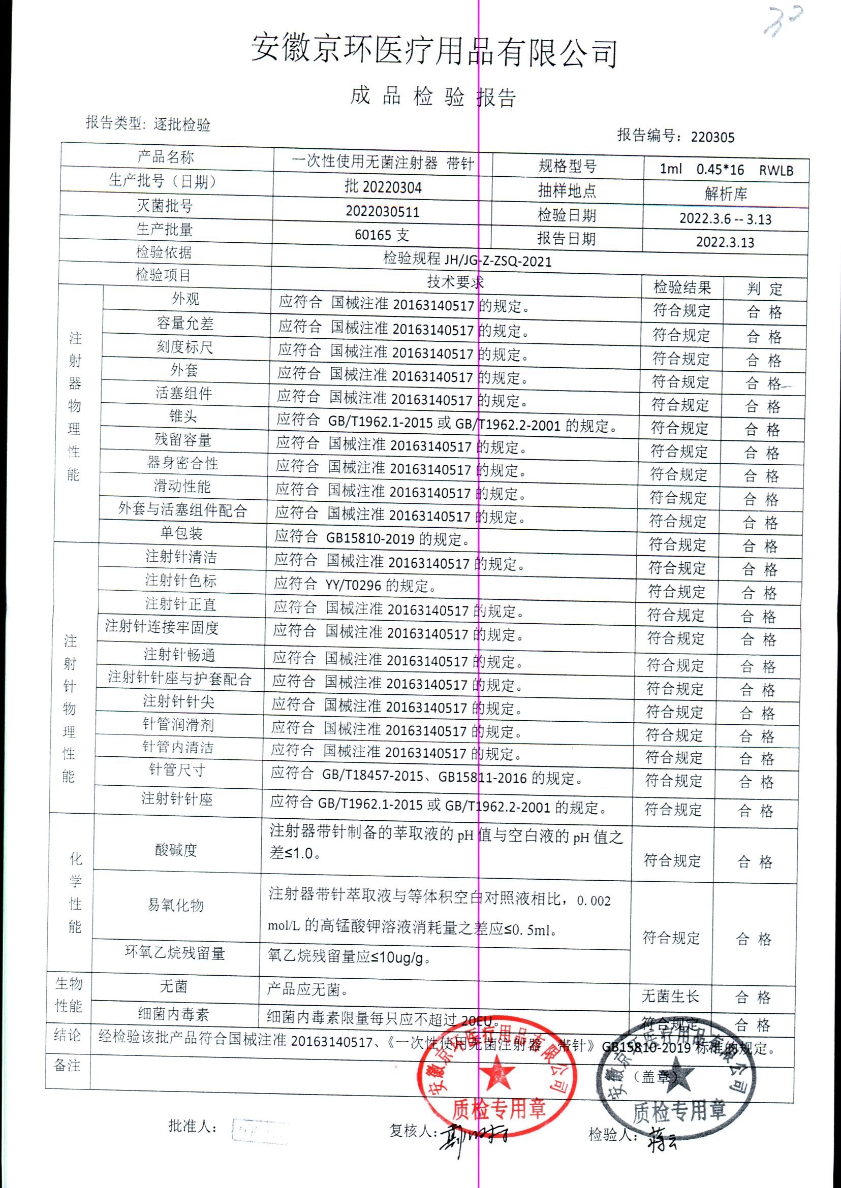 | 一次性使用无菌注射器 带针 | 1ml 0.45*16 | 批20220304 | 查看详情 |