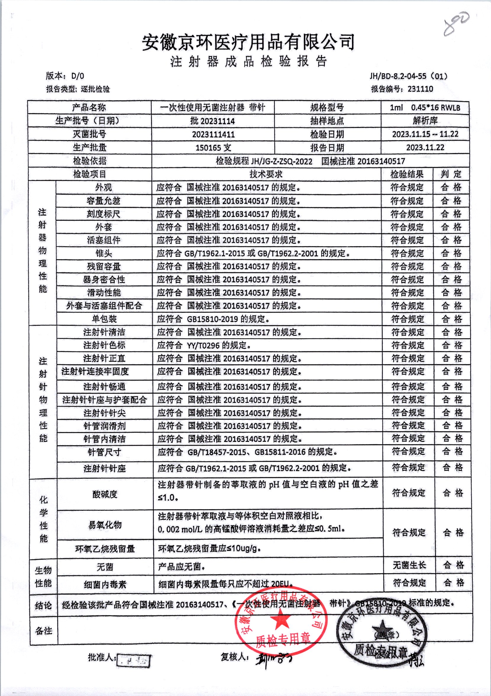 | 一次性使用无菌注射器 带针 | 1ml 0.45*16 | 批 20231114 | 查看详情 |