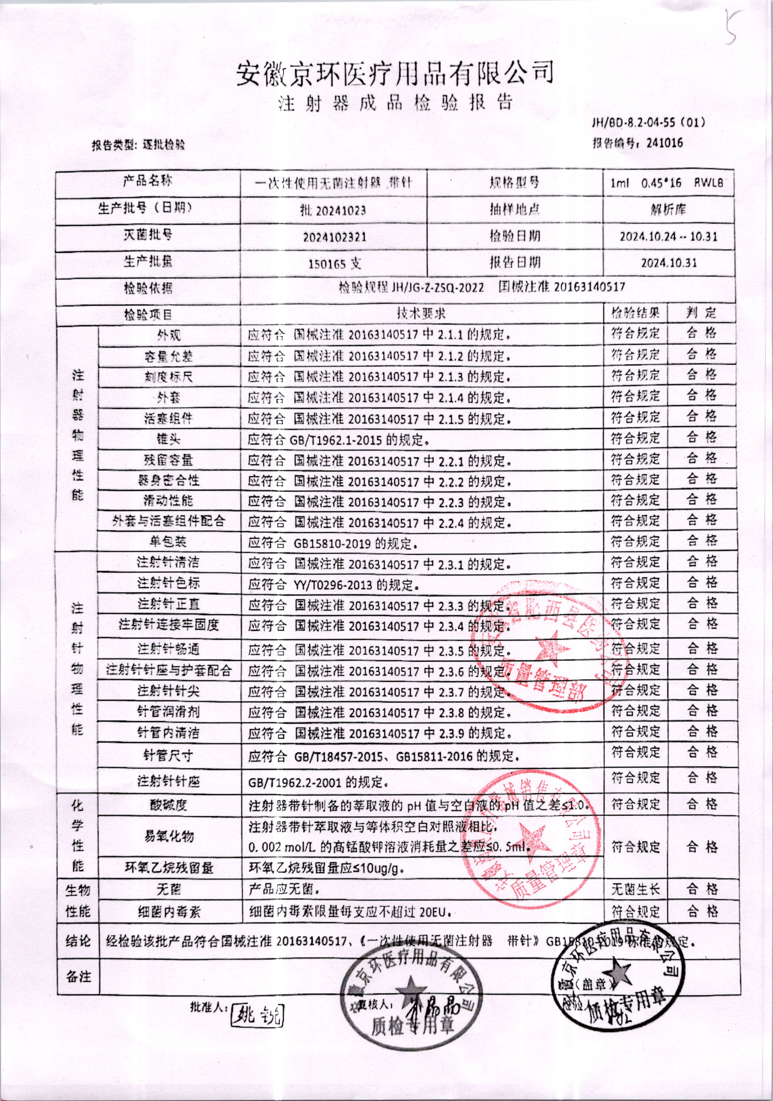 | 一次性使用无菌注射器 带针 | 1ml 0.45*16 | 批20241023 | 查看详情 |
