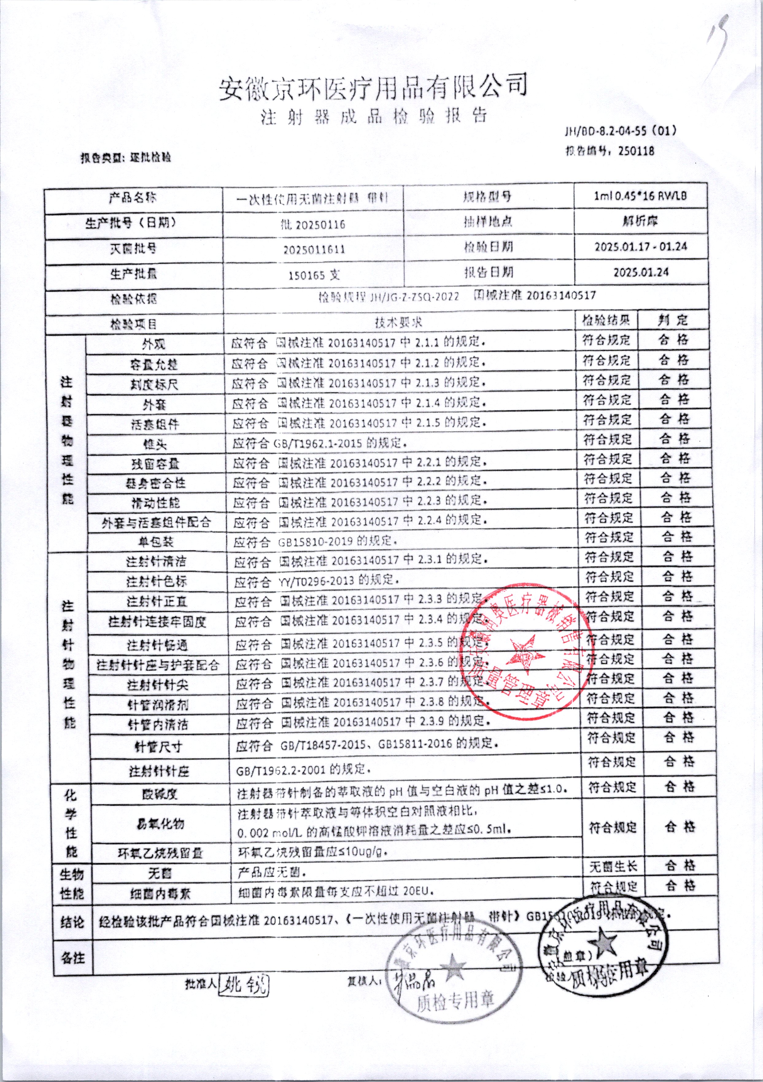 | 一次性使用无菌注射器 带针 | 1ml 0.45*16 | 批20250116 | 查看详情 |