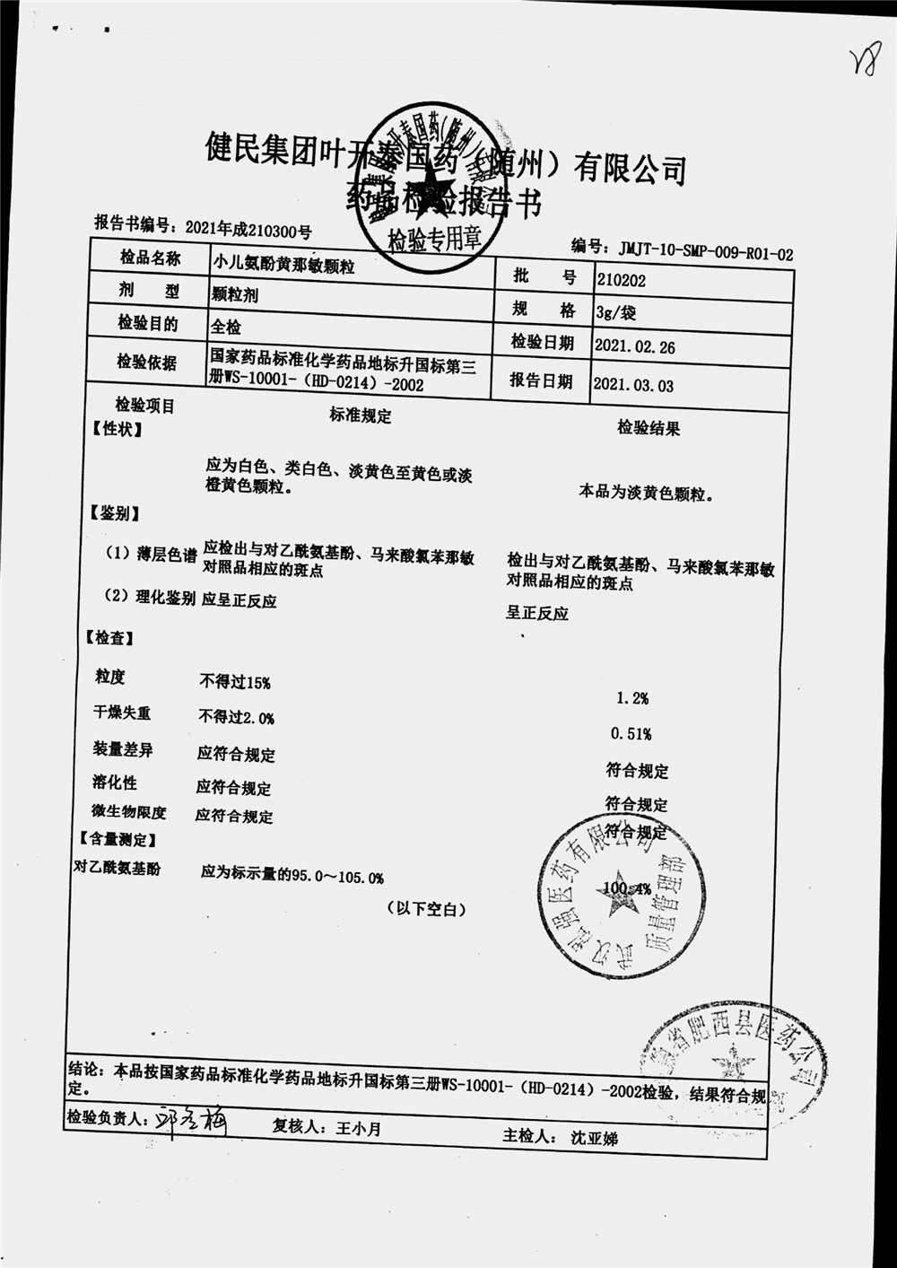 | 小儿氨酚黄那敏颗粒 | 3g | 210202 | 查看详情 |