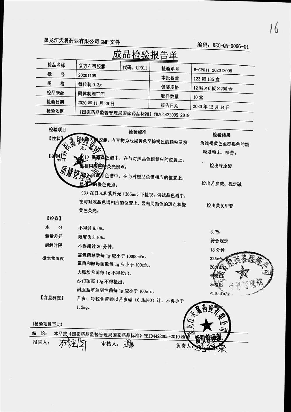 | 复方石韦胶囊 | 0.3g | 20201109(2/2) | 查看详情 |