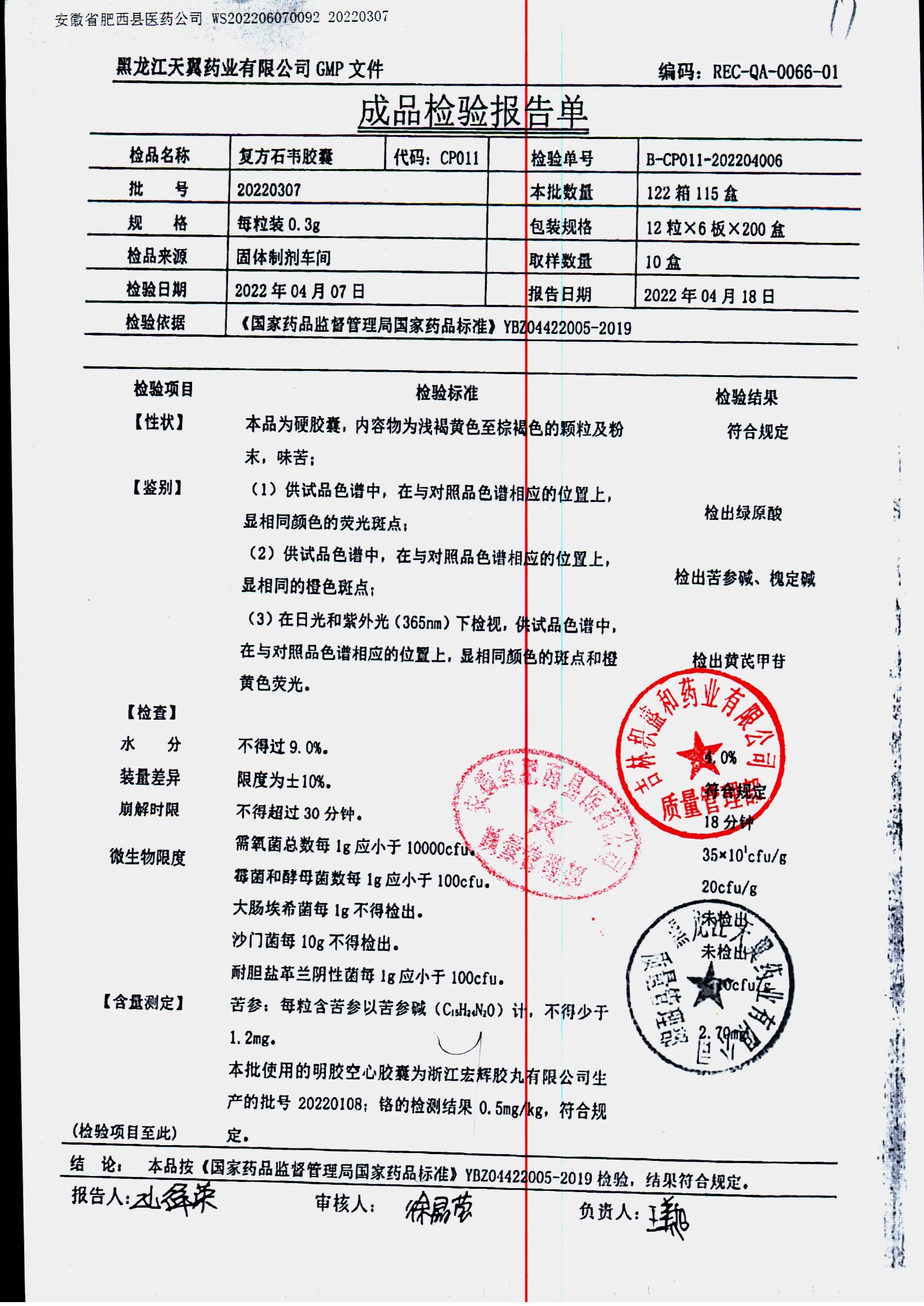 | 复方石韦胶囊 | 0.3g | 20220307 | 查看详情 |