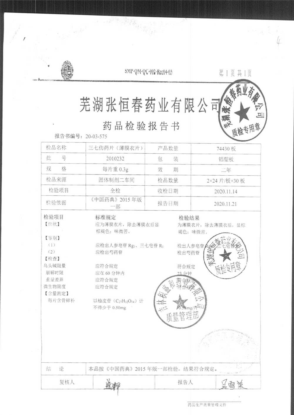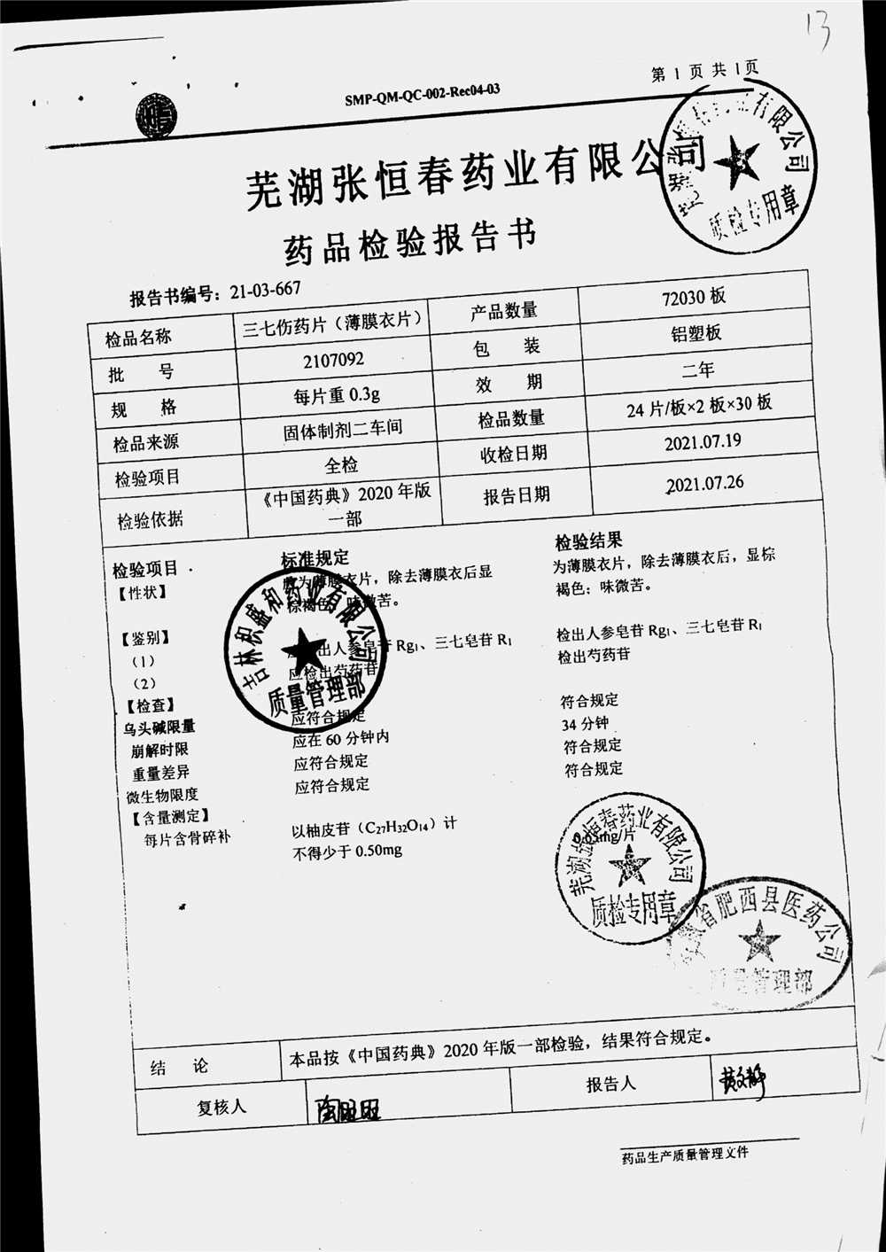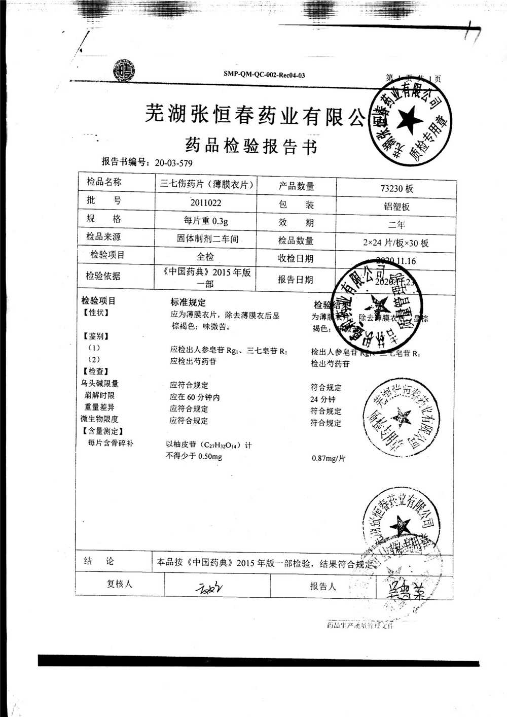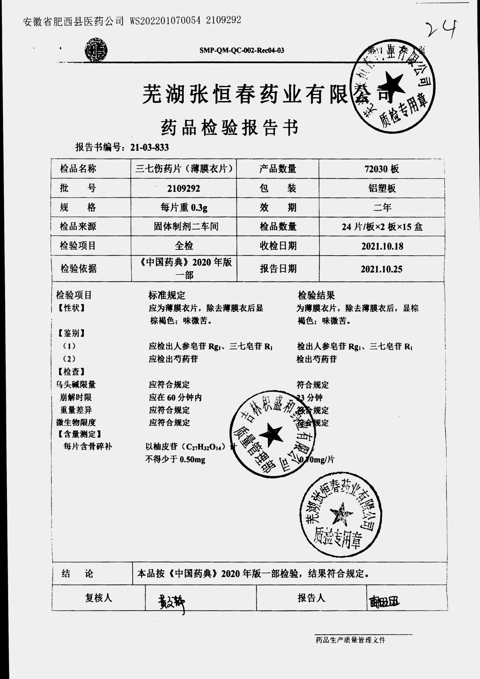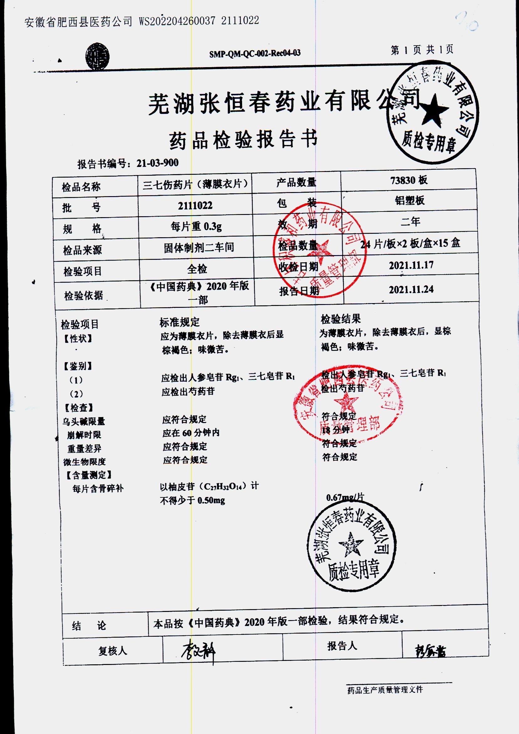 | 三七伤药片 | 0.3g | 2011022 | 查看详情 |