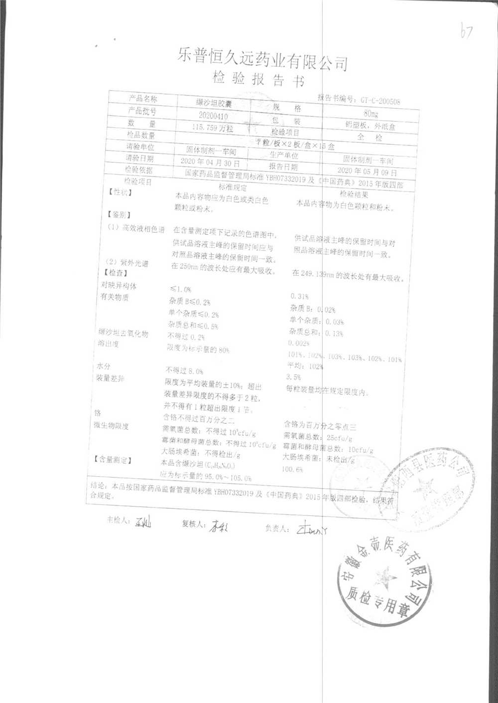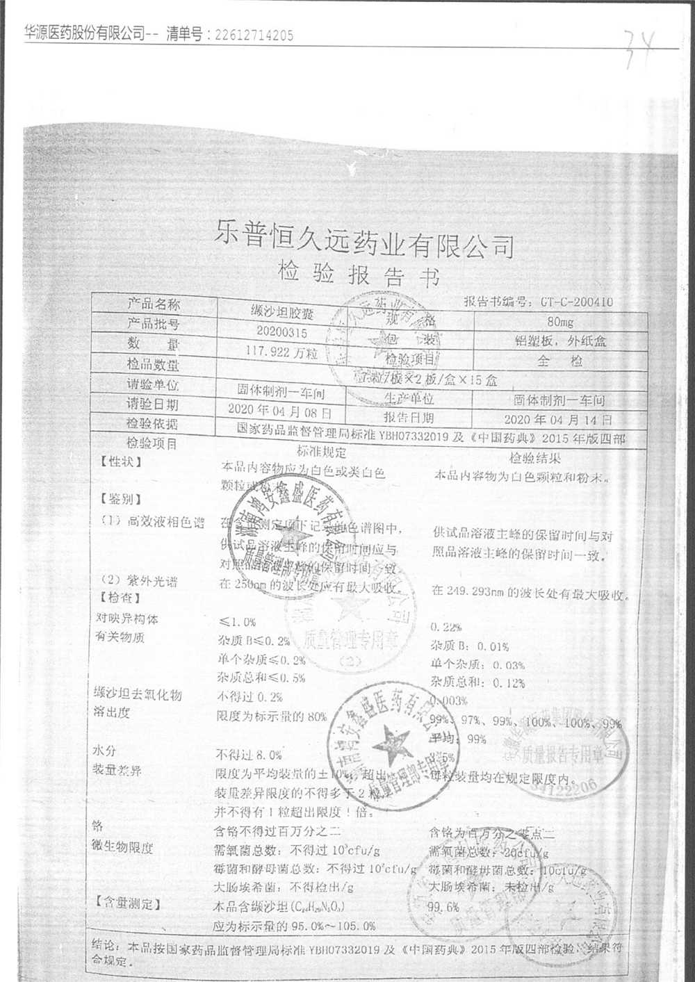 | 缬沙坦胶囊 | 80mg | 20200410 | 查看详情 |