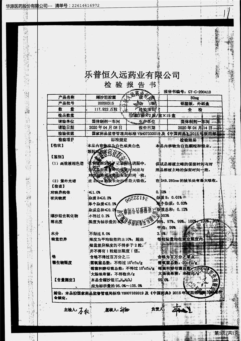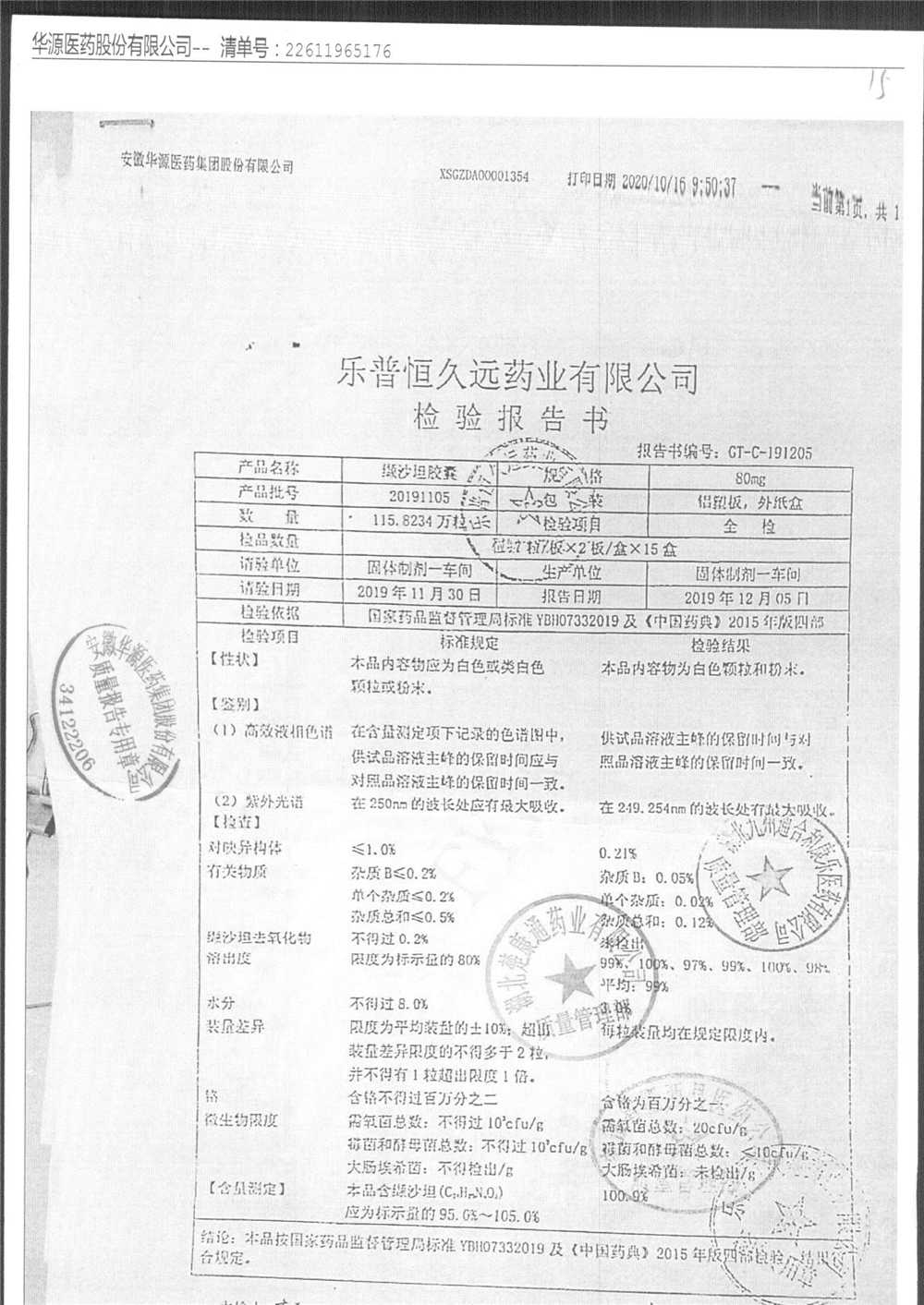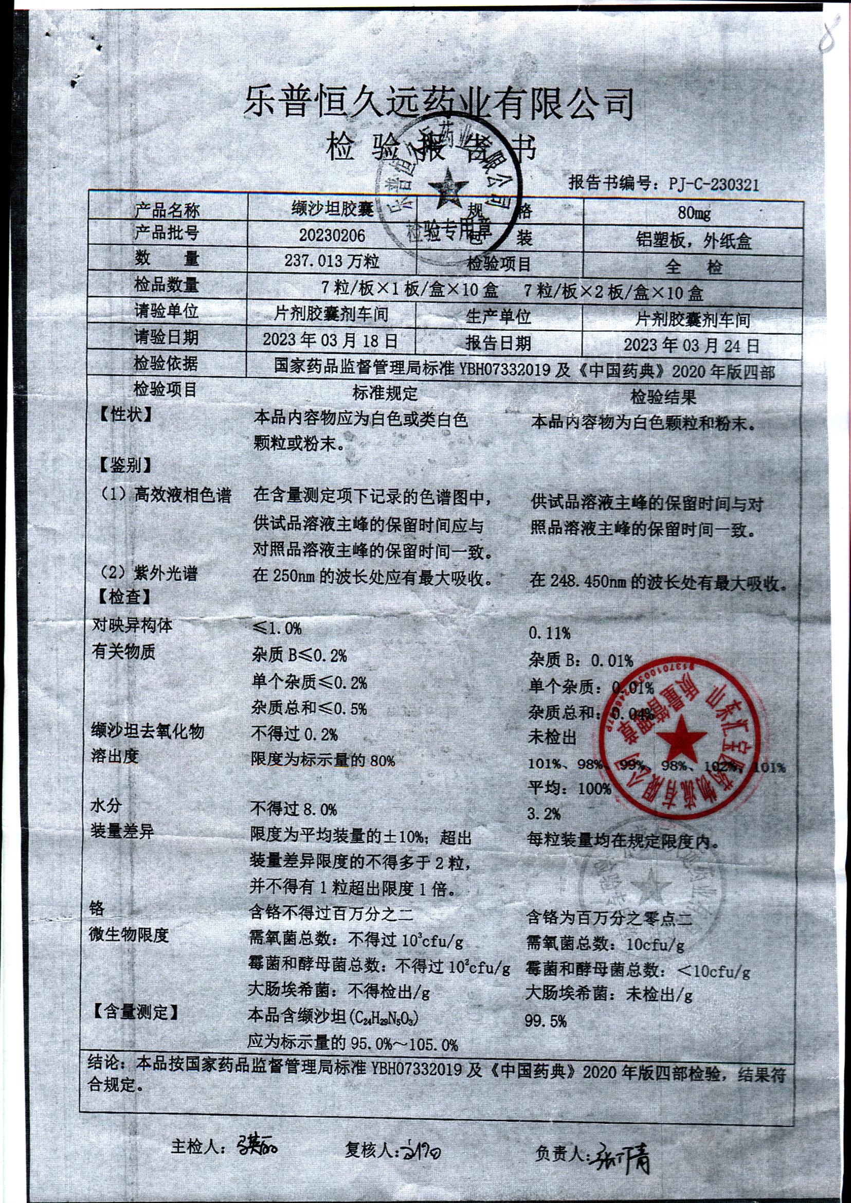 | 缬沙坦胶囊 | 80mg | 20200315 | 查看详情 |