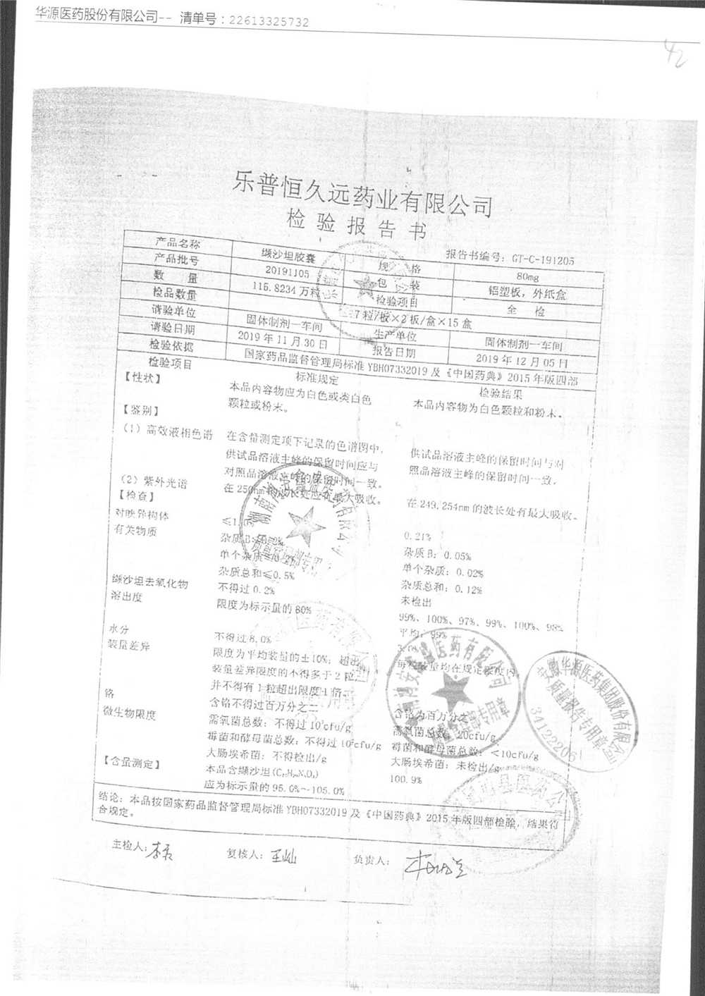 | 缬沙坦胶囊 | 80mg | 20191105 | 查看详情 |