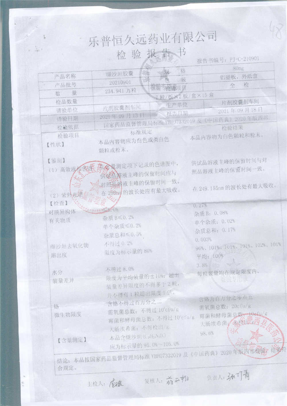 | 缬沙坦胶囊 | 80mg | 20210901 | 查看详情 |