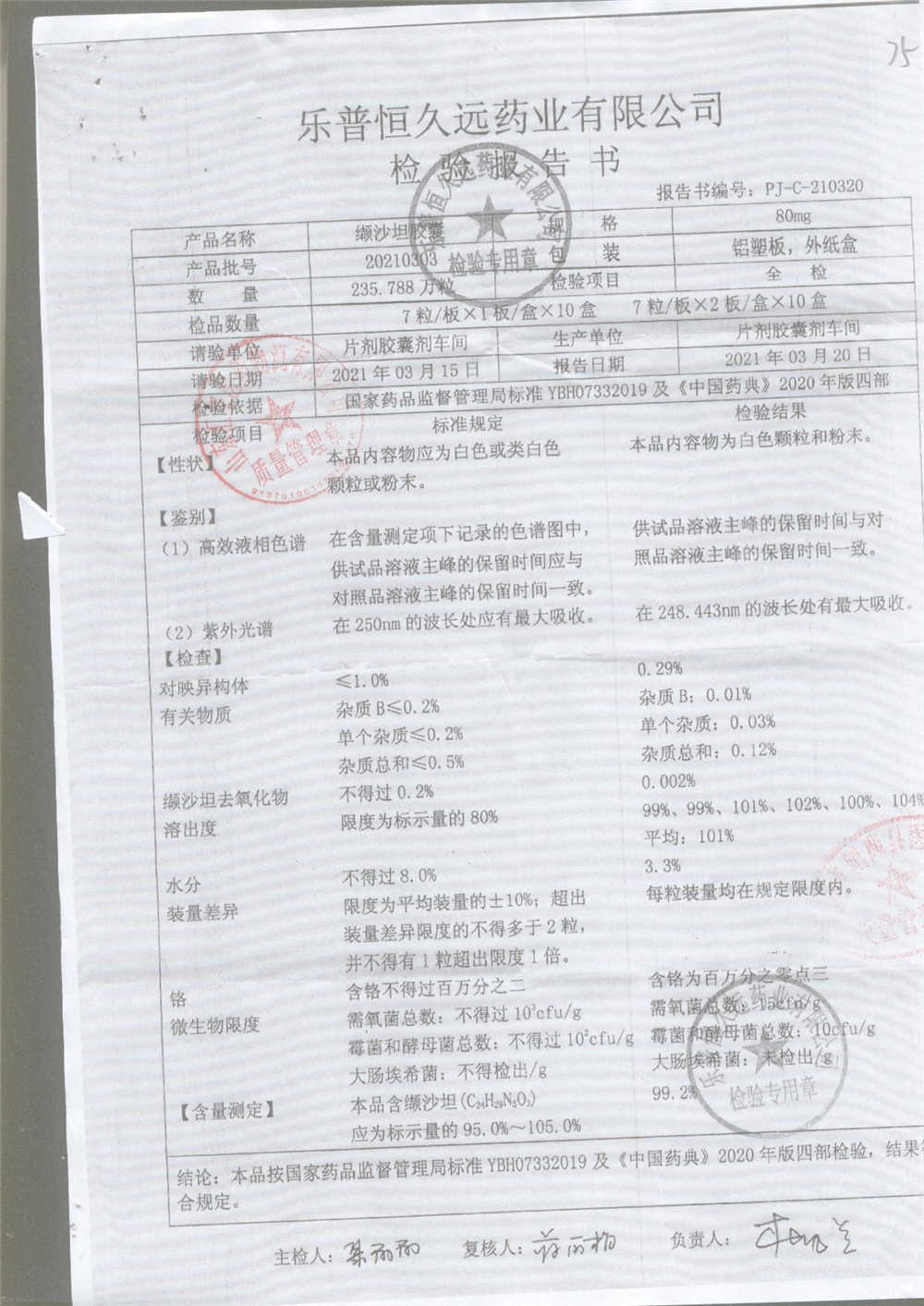 | 缬沙坦胶囊 | 80mg | 20210303 | 查看详情 |