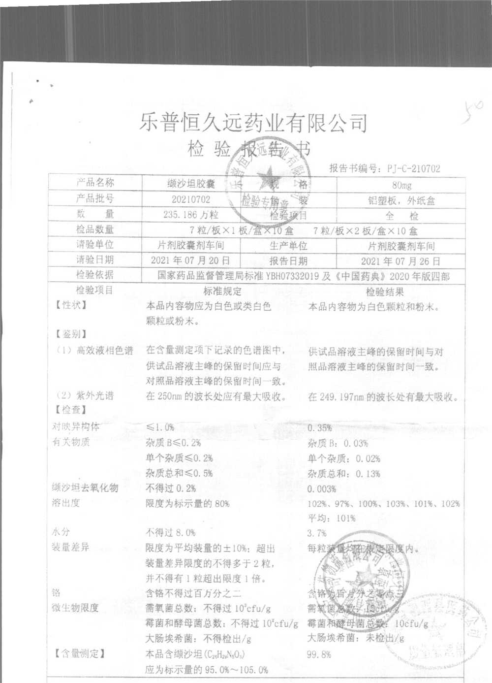 | 缬沙坦胶囊 | 80mg | 20210702 | 查看详情 |