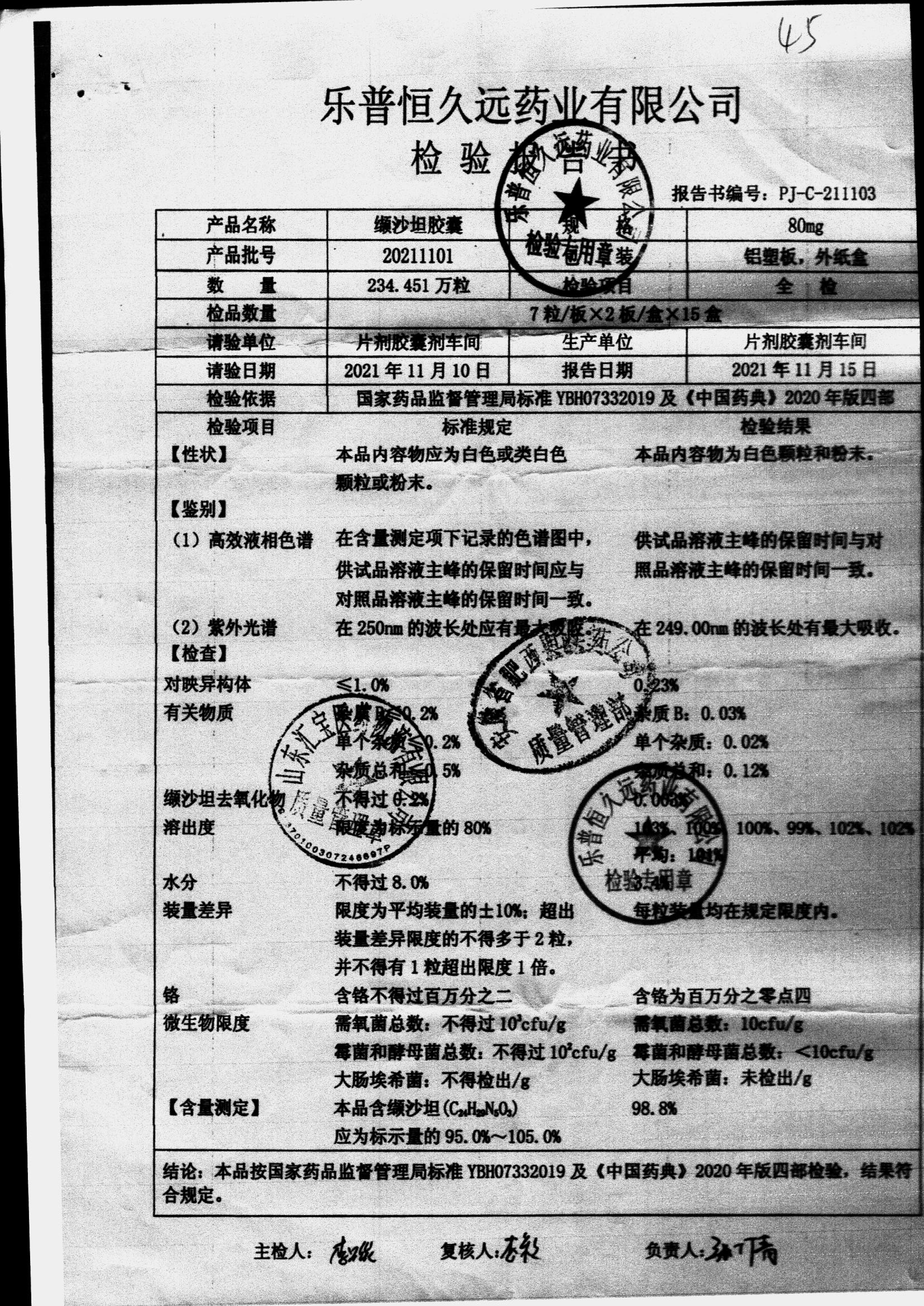 | 缬沙坦胶囊 | 80mg | 20211101 | 查看详情 |