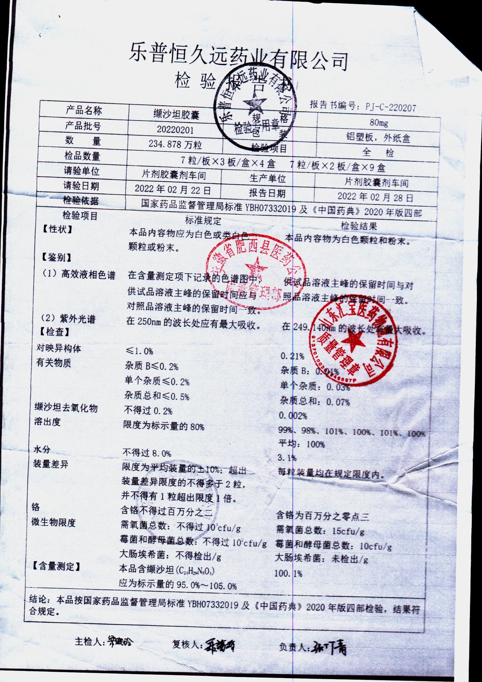 | 缬沙坦胶囊 | 80mg | 20220201 | 查看详情 |