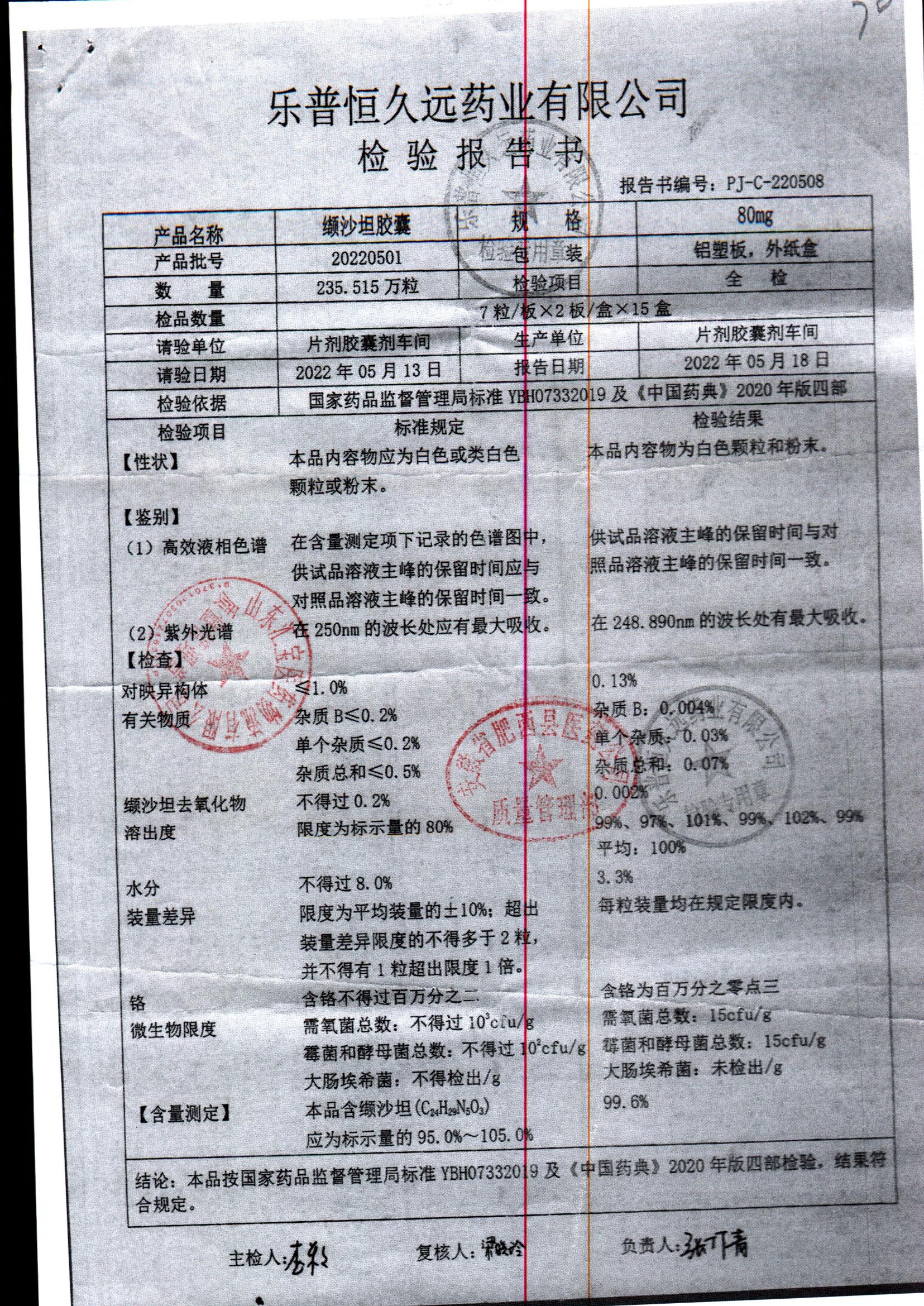 | 缬沙坦胶囊 | 80mg | 20220501 | 查看详情 |