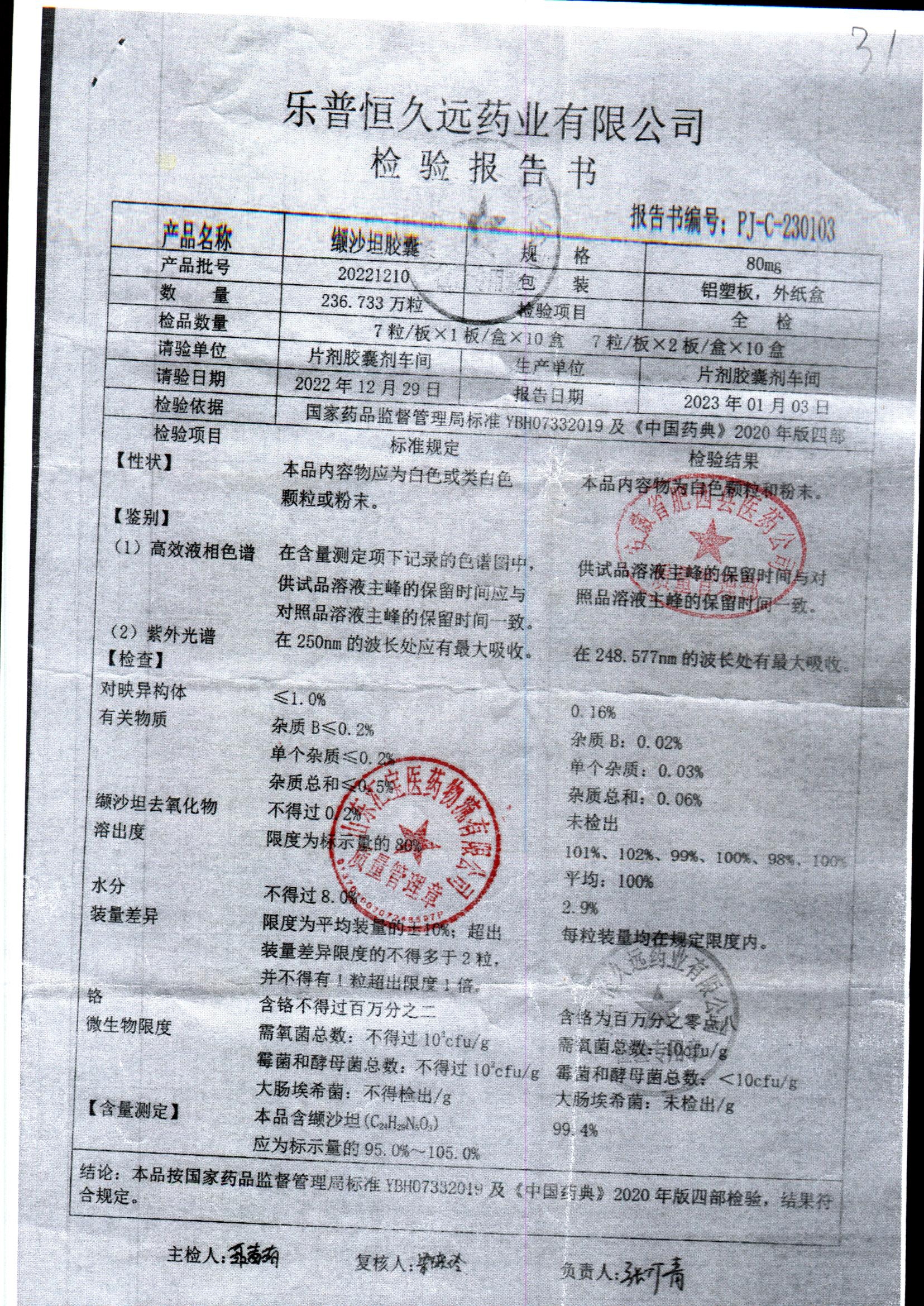 | 缬沙坦胶囊 | 80mg | 20221210 | 查看详情 |
