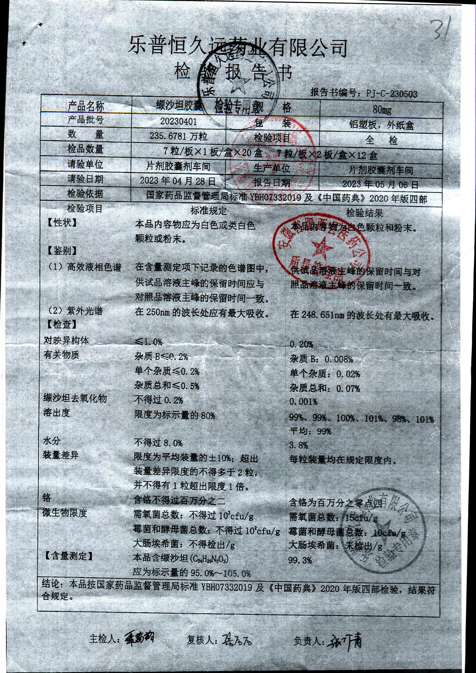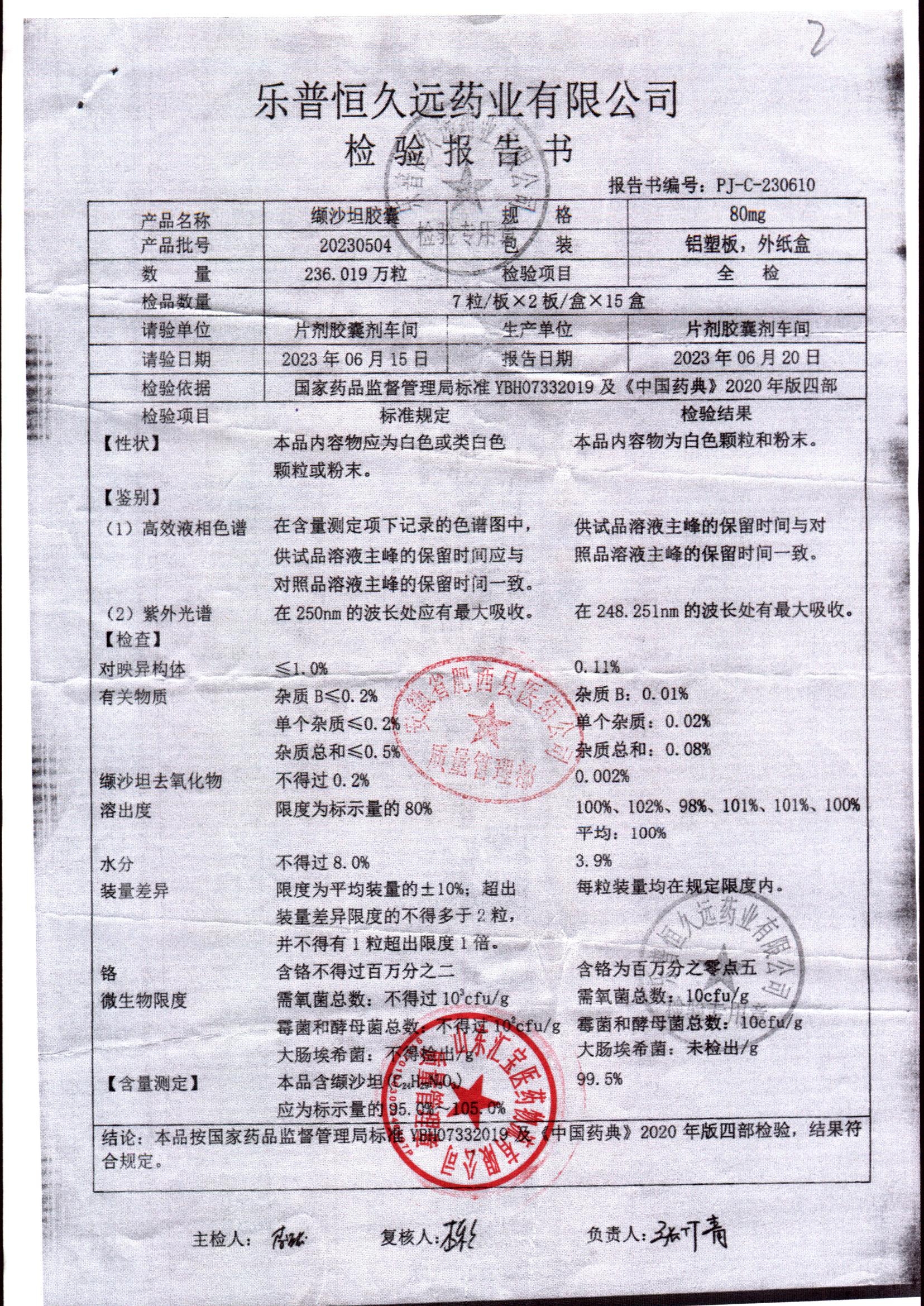 | 缬沙坦胶囊 | 80mg | 20230504 | 查看详情 |
