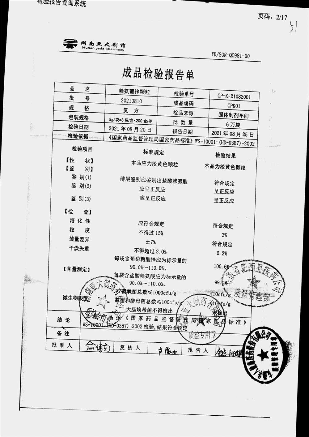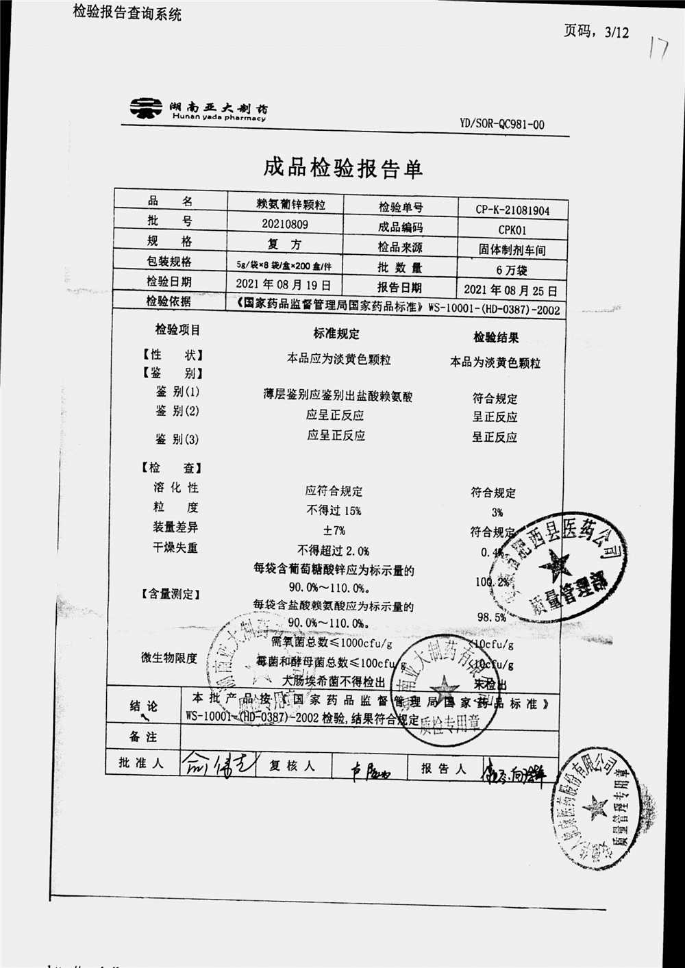 | 赖氨葡锌颗粒 | 5g*8袋 | 20210810 | 查看详情 |