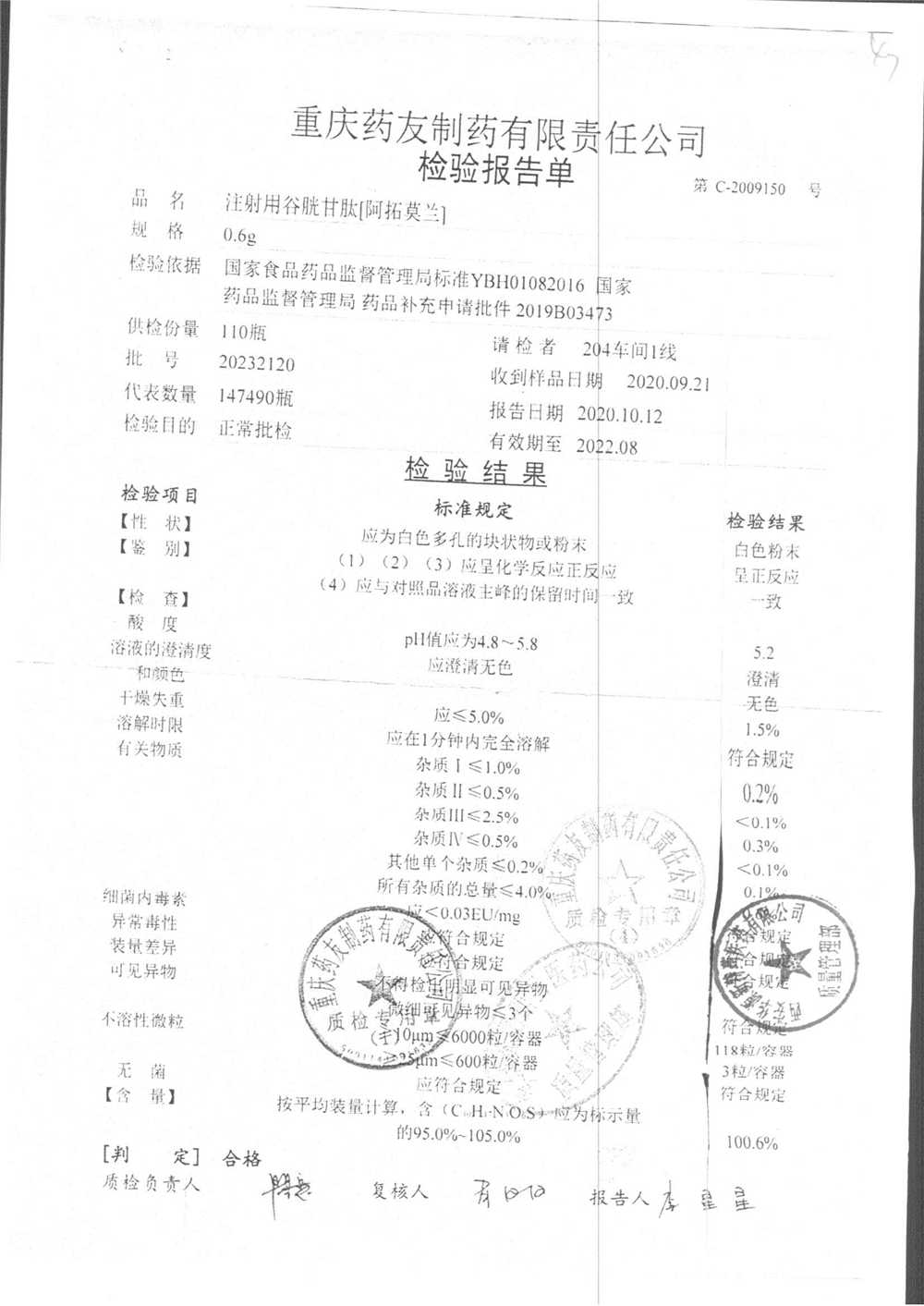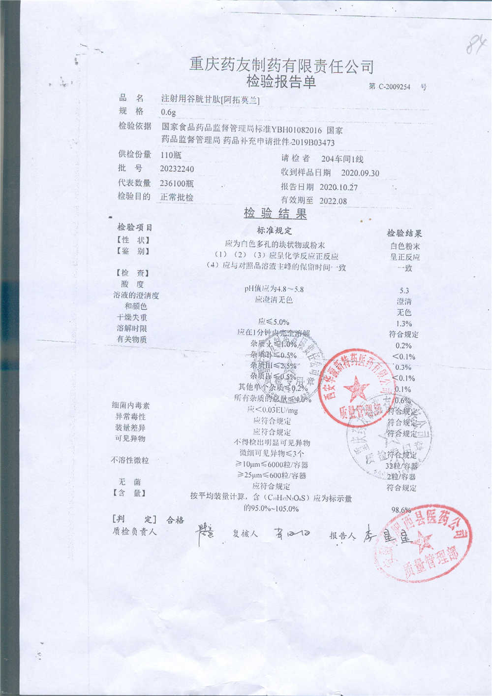 | 注射用谷胱甘肽 | 0.6g | 20232280 | 查看详情 |