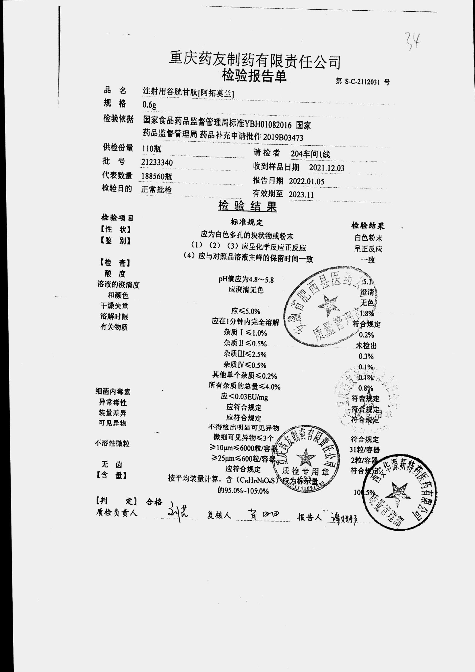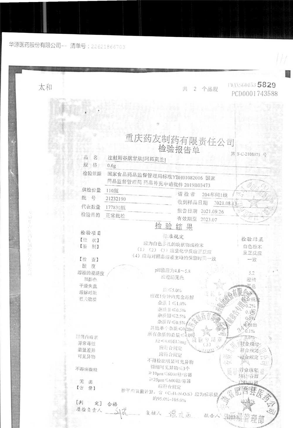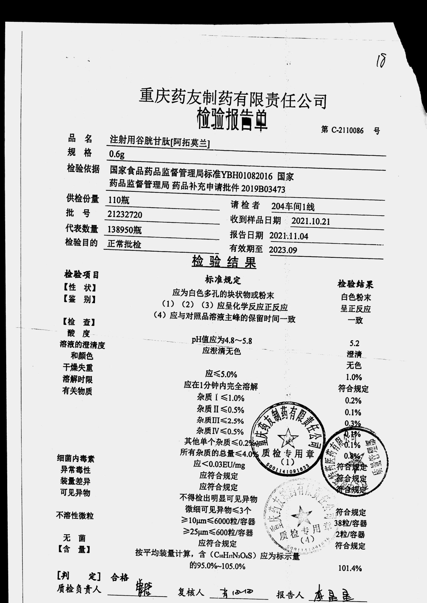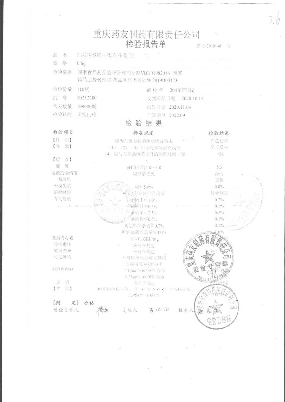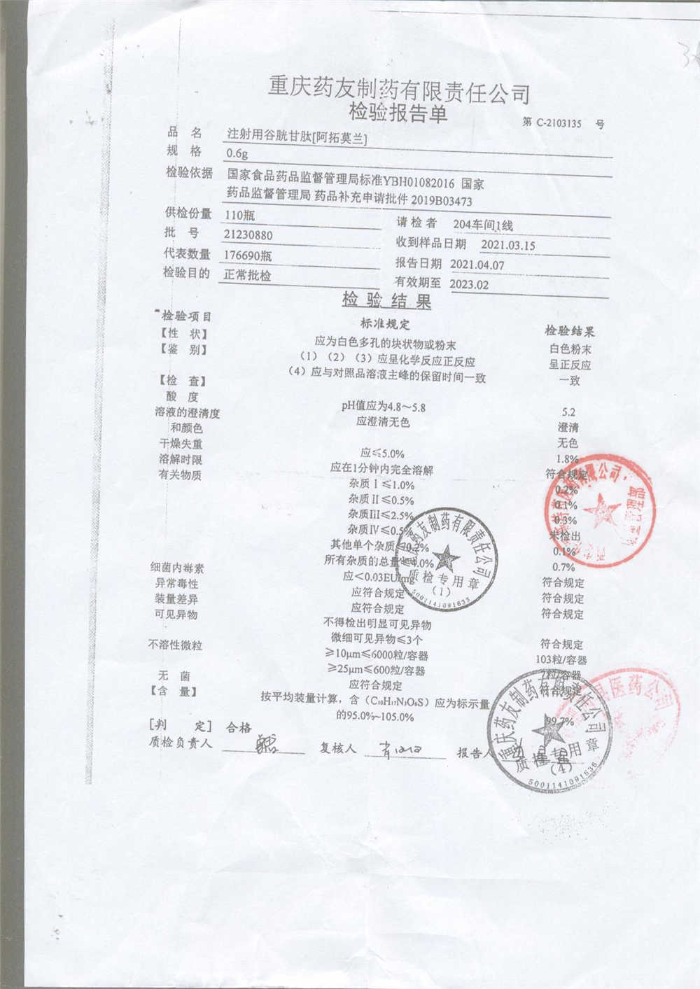 | 注射用谷胱甘肽 | 0.6g | 20232120 | 查看详情 |