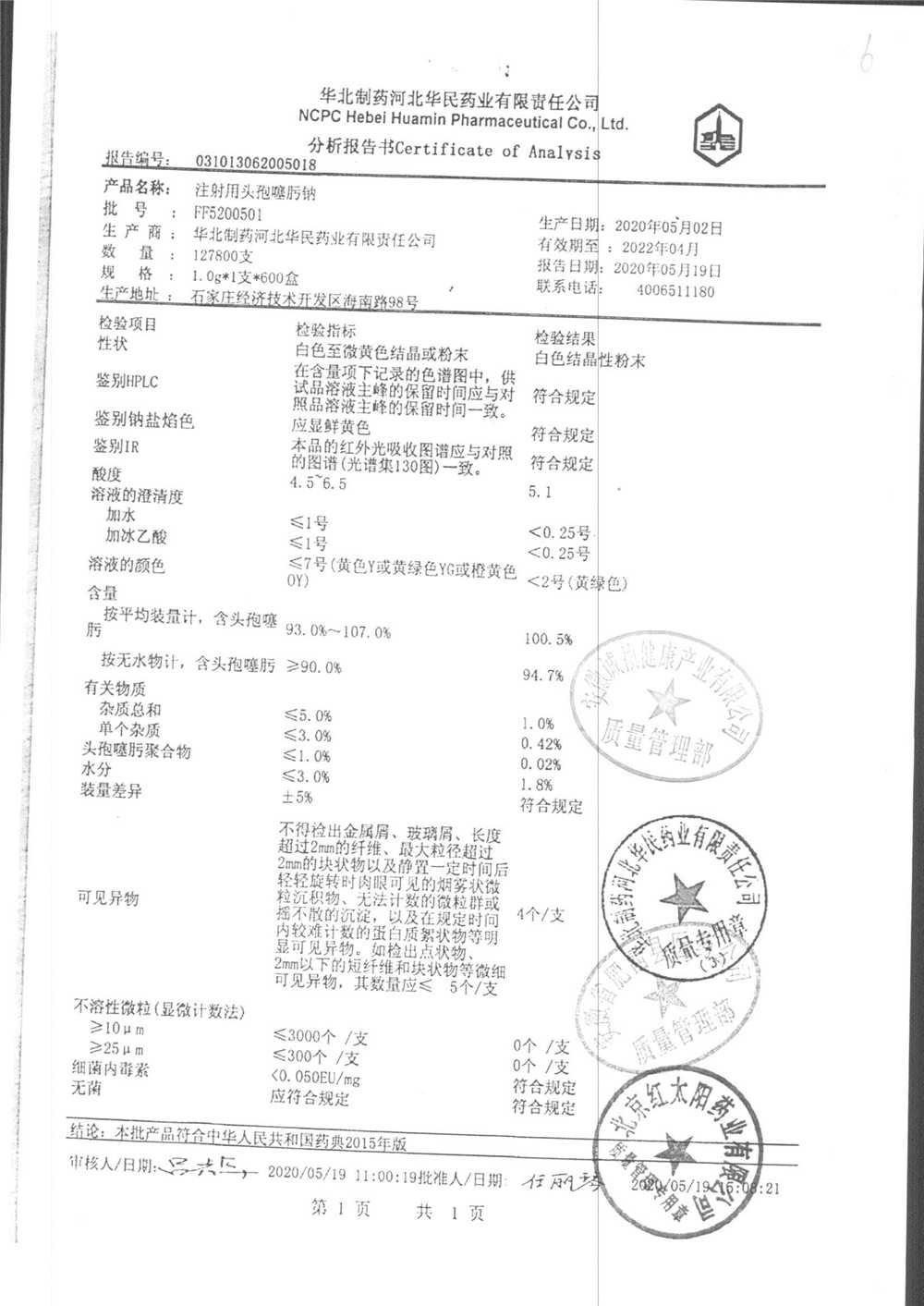 | 注射用头孢噻肟钠 | 1.0g | FF5200501 | 查看详情 |