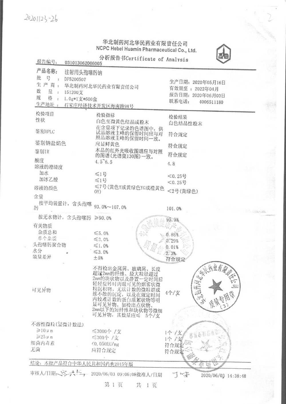| 注射用头孢噻肟钠 | 1.0g | DFY541101/2 | 查看详情 |