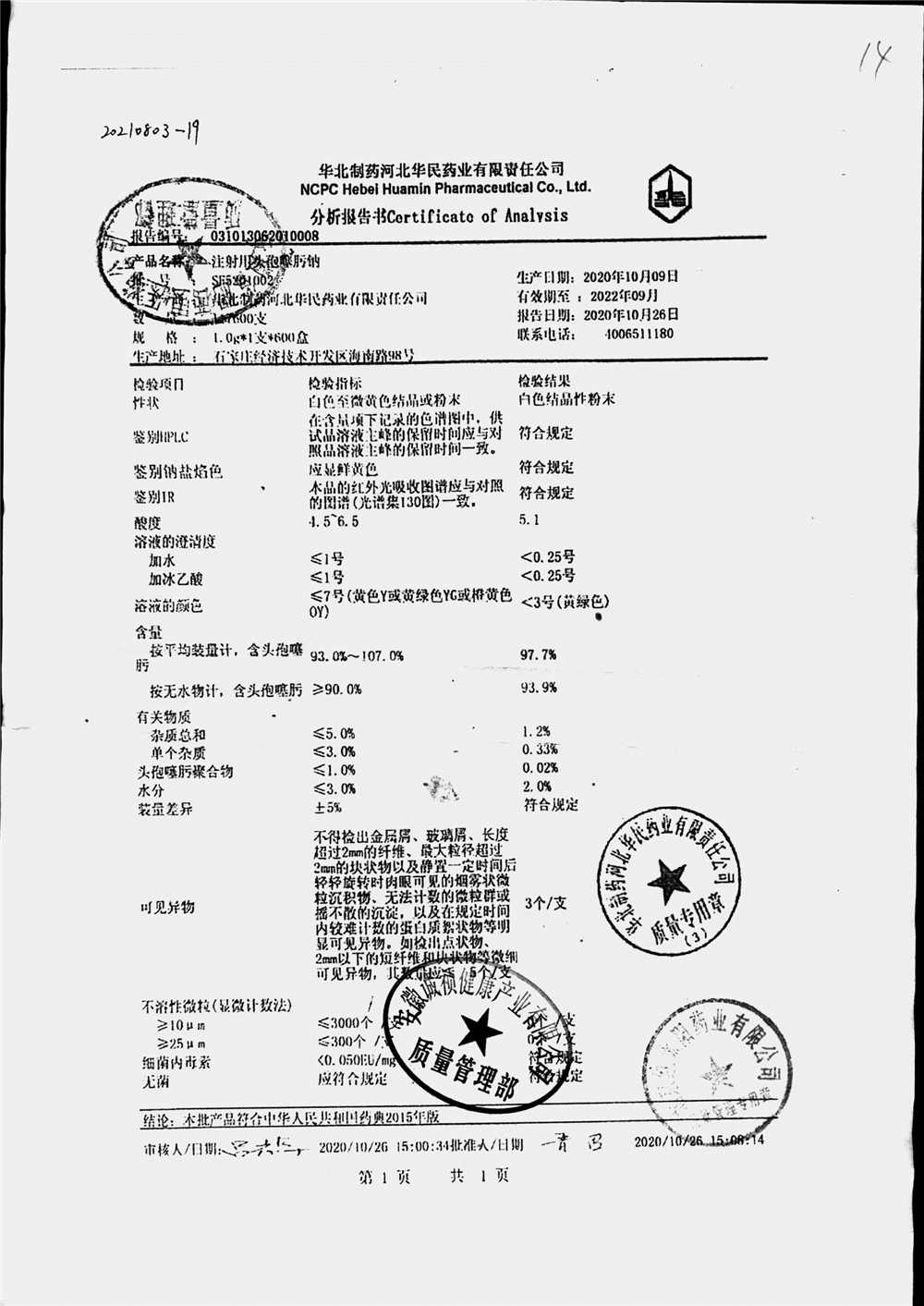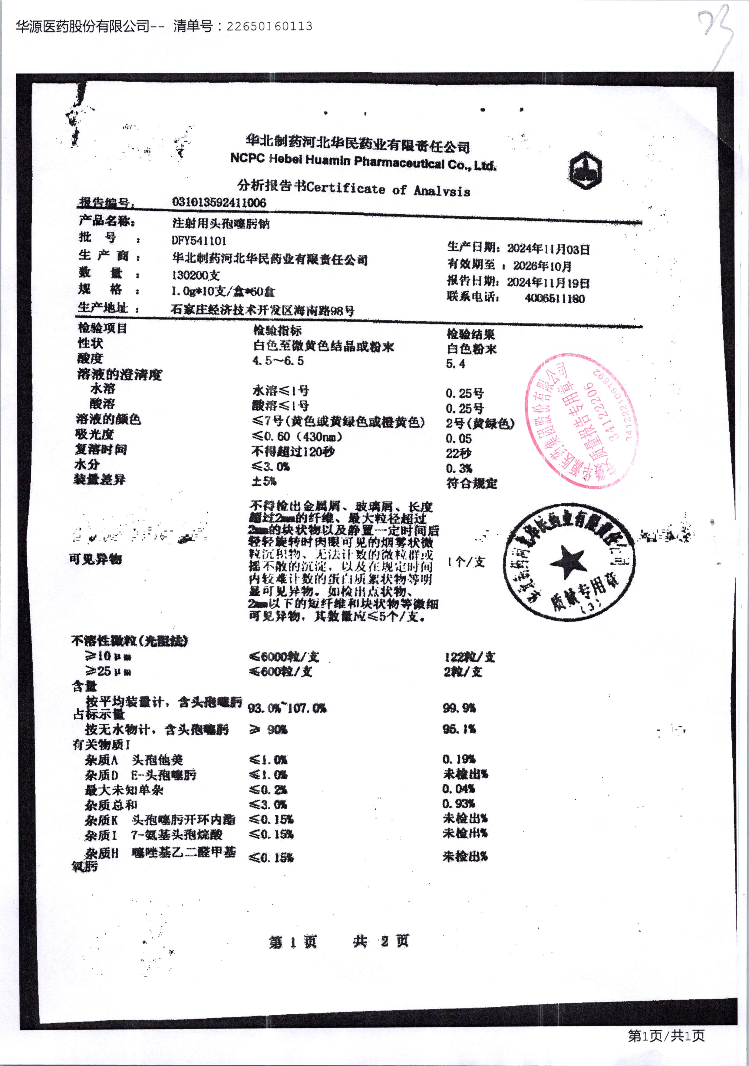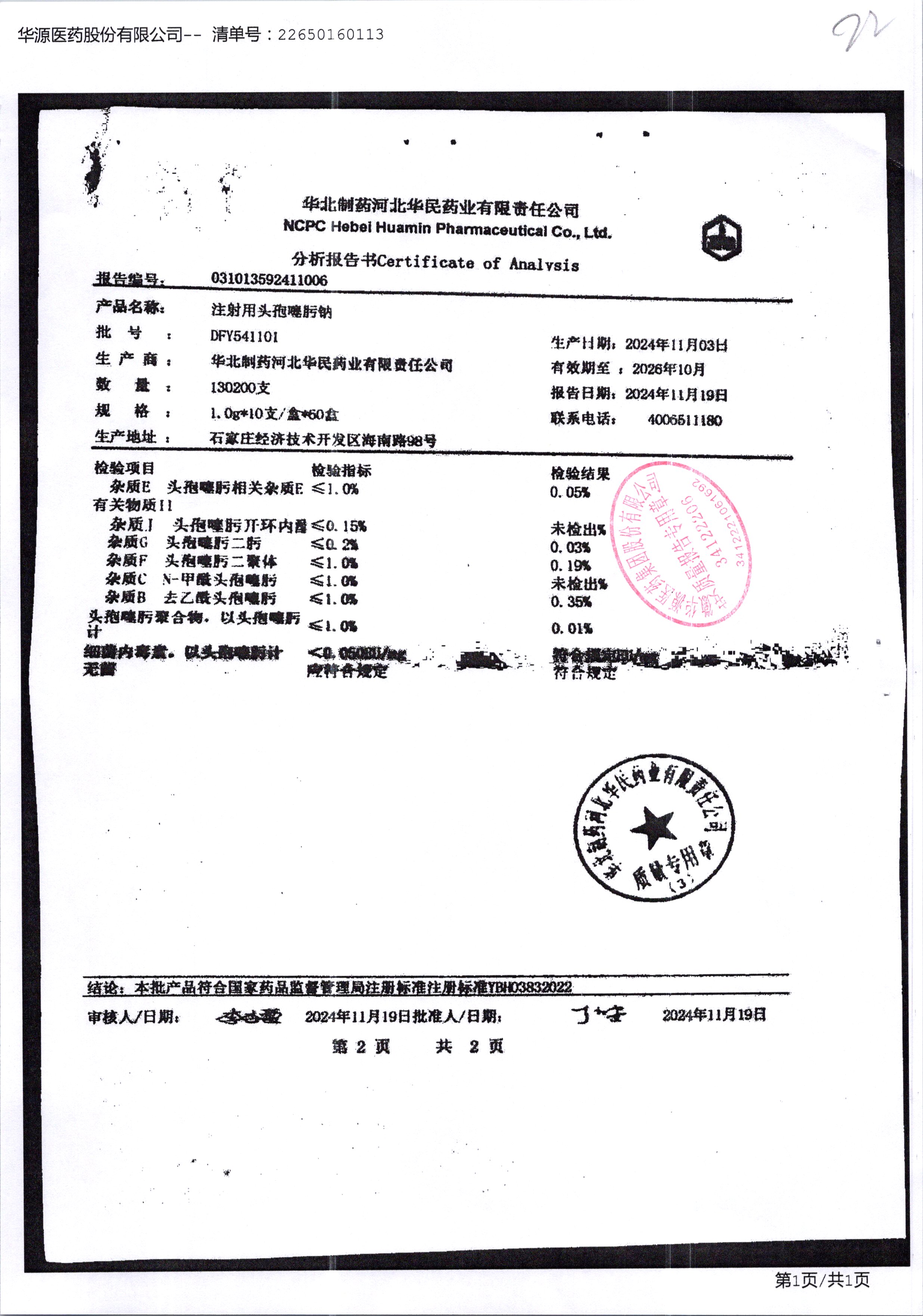 | 注射用头孢噻肟钠 | 1.0g | DFY541101/1 | 查看详情 |