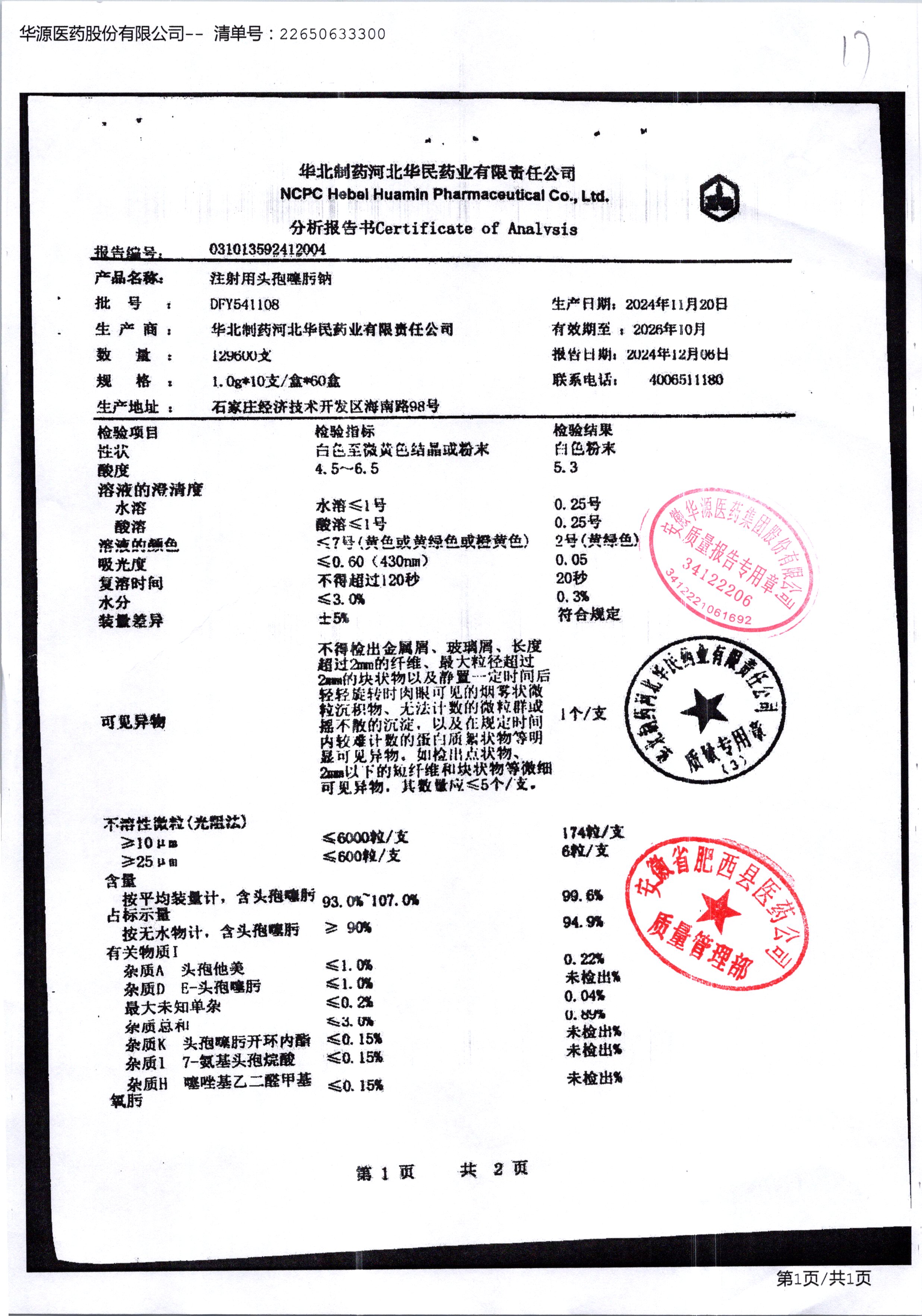 | 注射用头孢噻肟钠 | 1.0g | DF5200507 | 查看详情 |