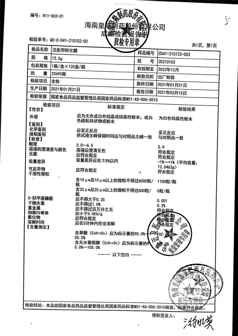 | 注射用转化糖 | 12.5g | 20210103 | 查看详情 |