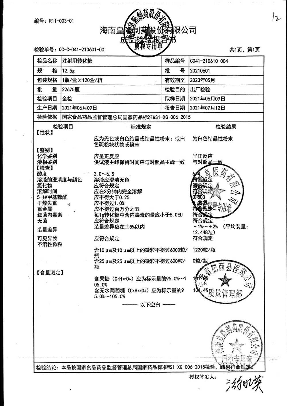 | 注射用转化糖 | 12.5g | 20210601 | 查看详情 |