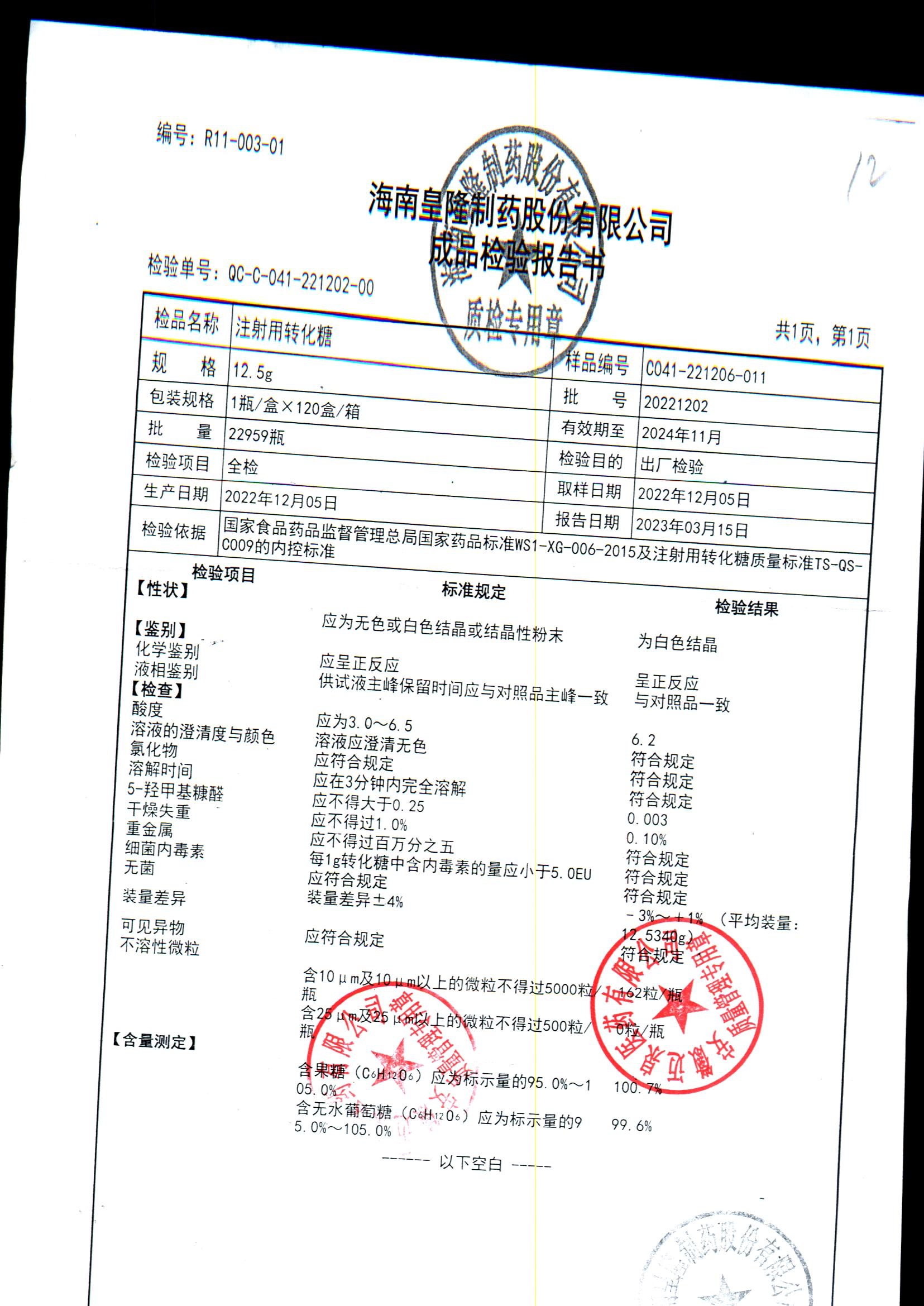 | 注射用转化糖 | 12.5g | 20221201 | 查看详情 |
