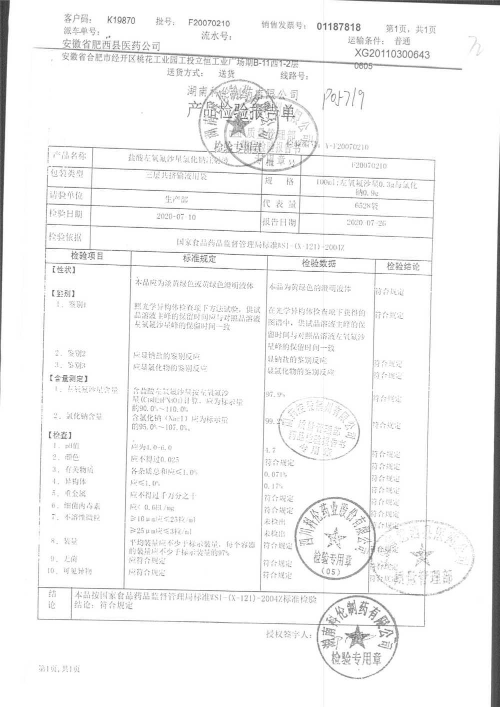 | 盐酸左氧氟沙星氯化钠注射液 | 100ml | F20070210 | 查看详情 |