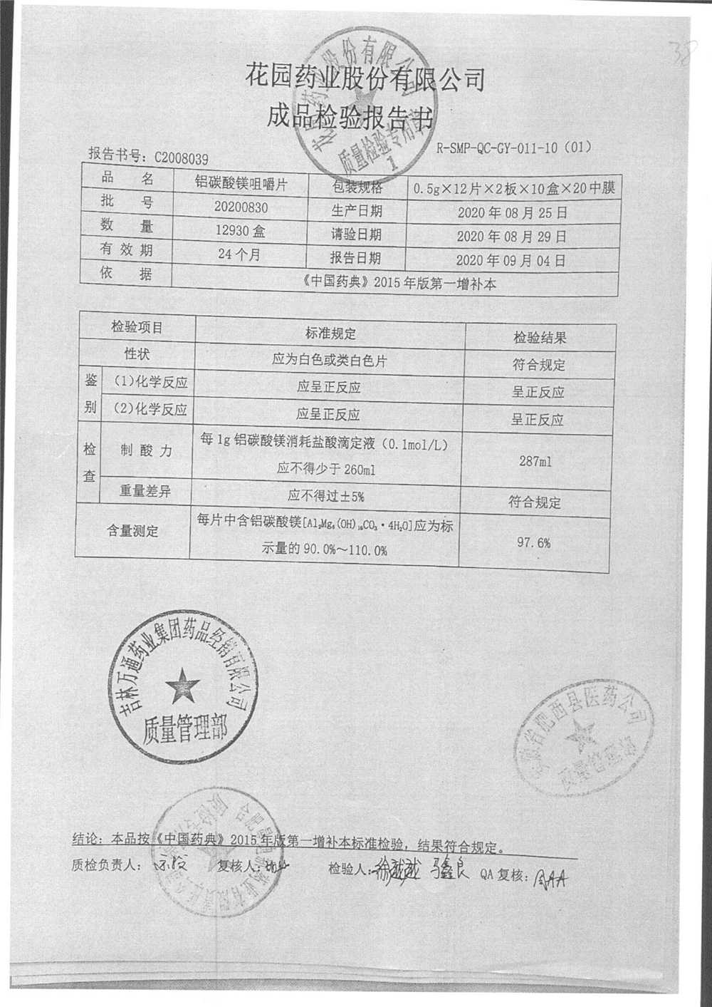 | 铝碳酸镁咀嚼片 | 0.5g*12*2 | 20200830 | 查看详情 |