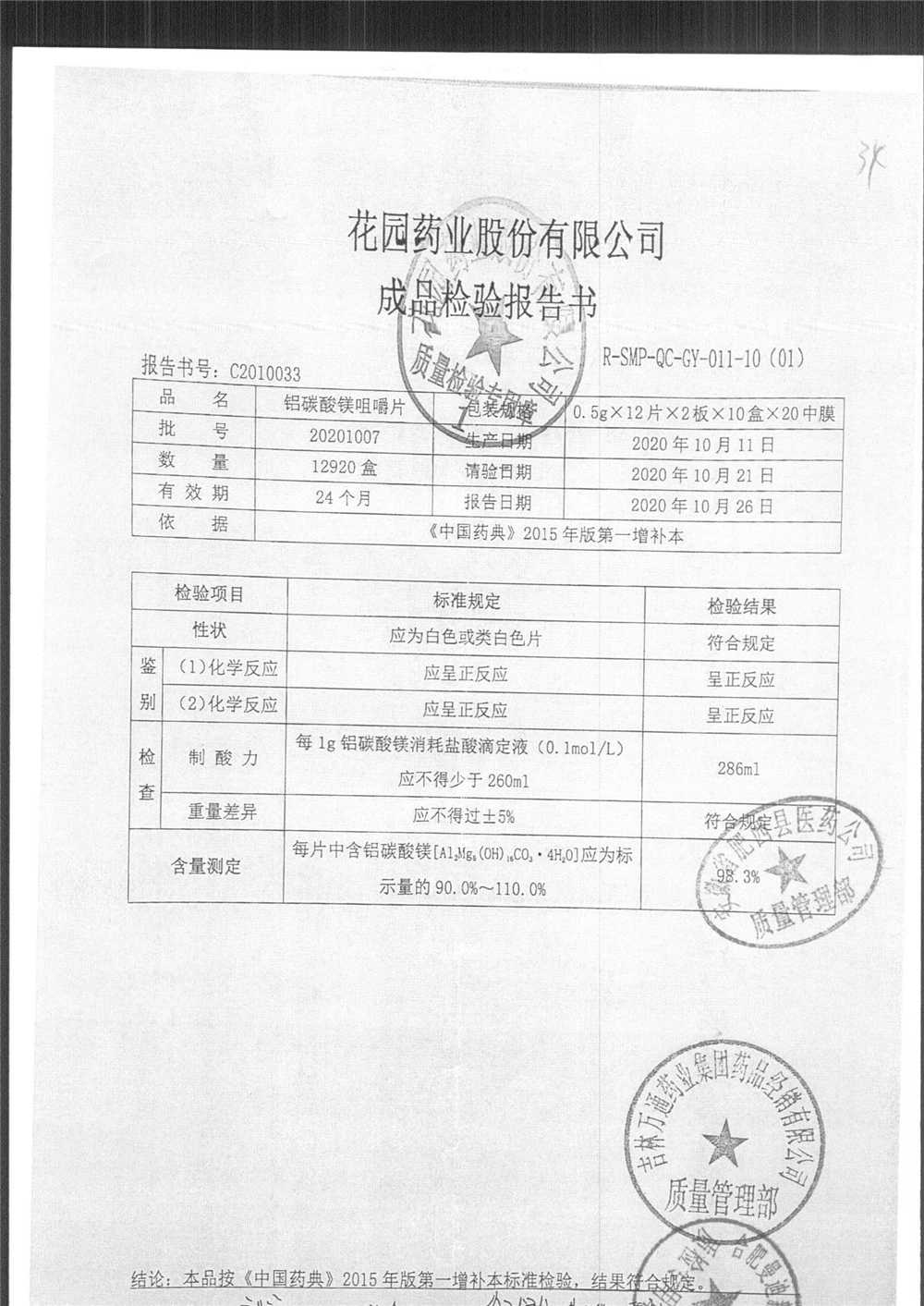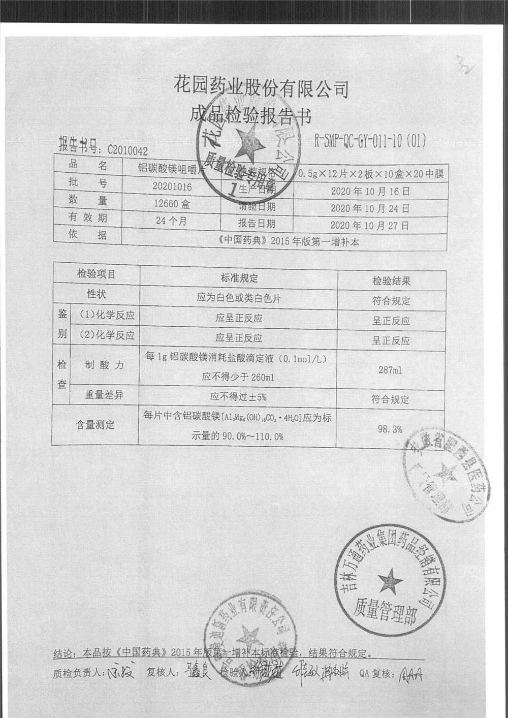 | 铝碳酸镁咀嚼片 | 0.5g*12*2 | 20201016 | 查看详情 |