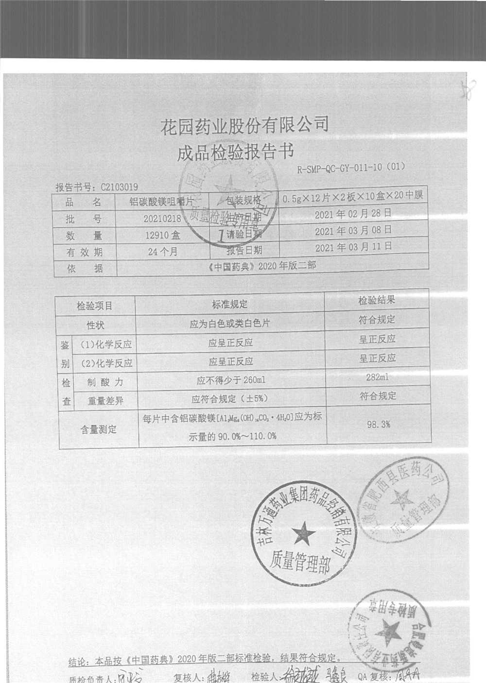 | 铝碳酸镁咀嚼片 | 0.5g*12*2 | 20210218 | 查看详情 |