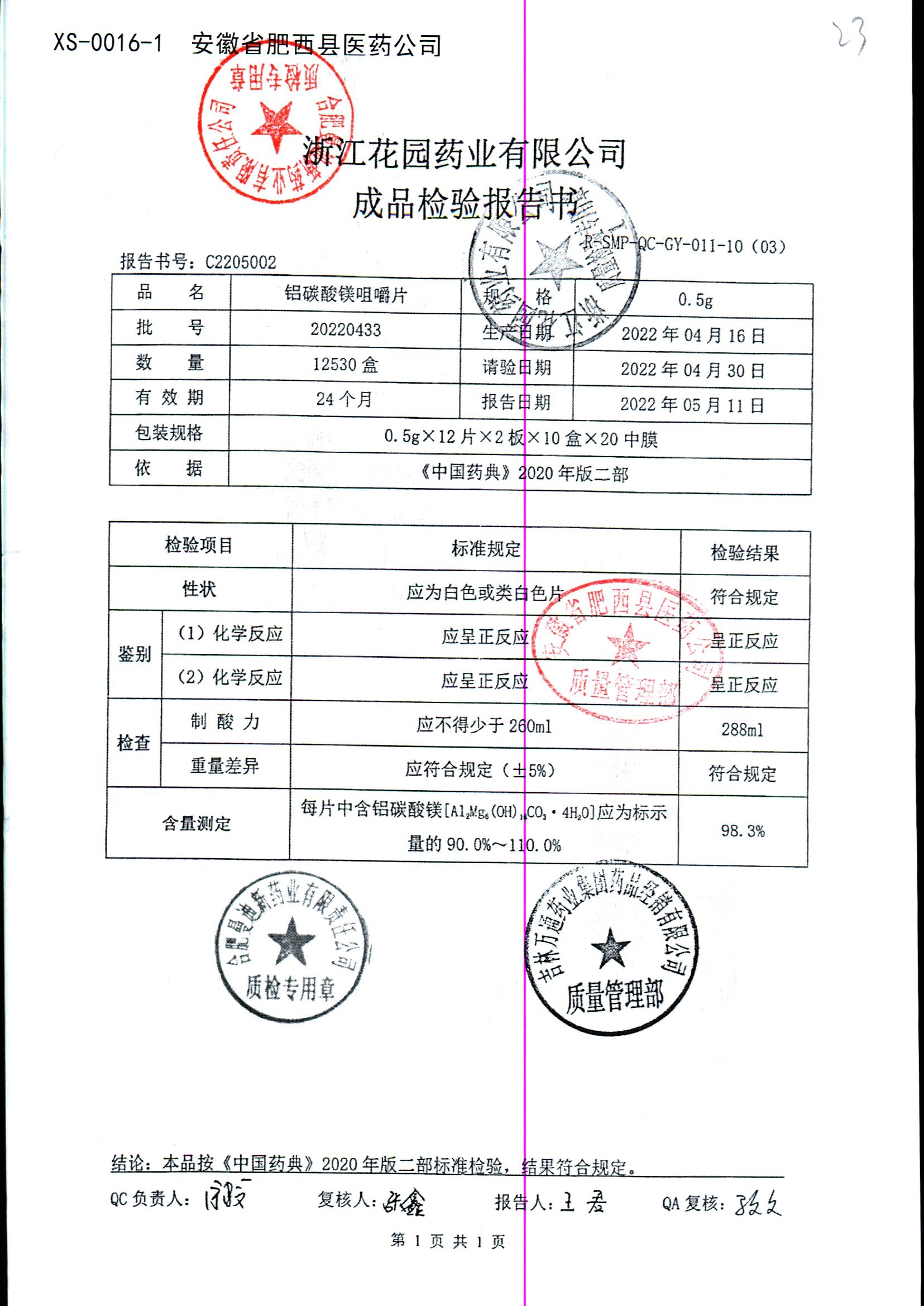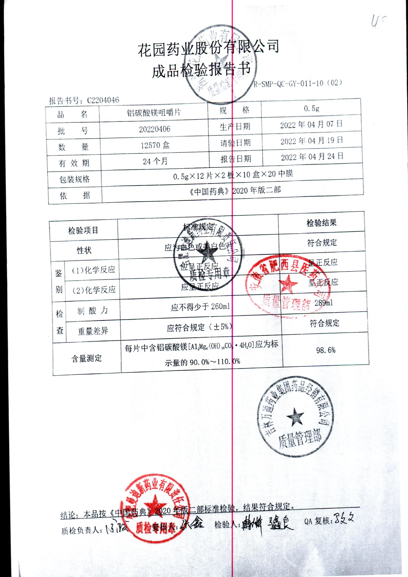 | 铝碳酸镁咀嚼片 | 0.5g*12*2 | 20220406 | 查看详情 |