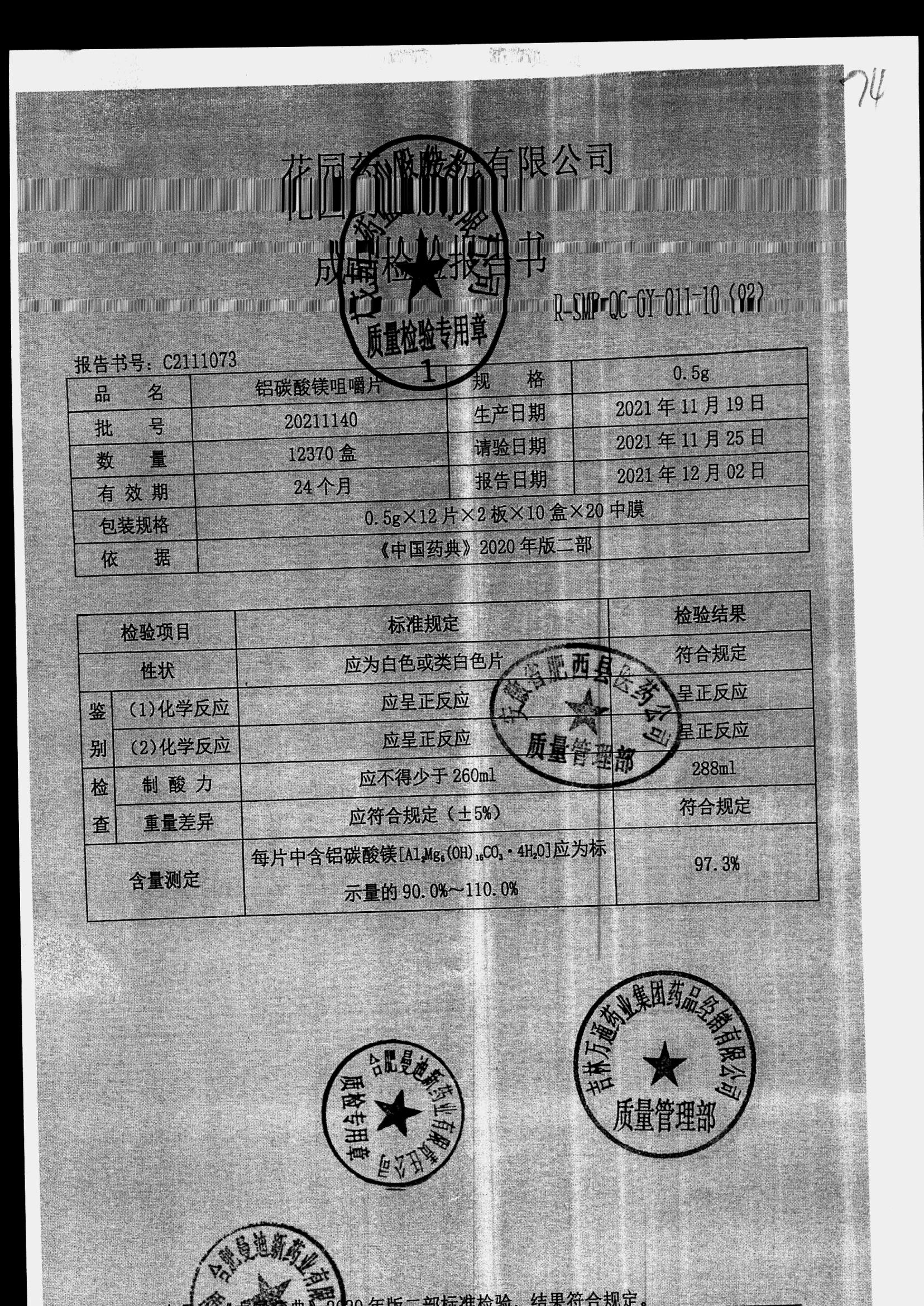 | 铝碳酸镁咀嚼片 | 0.5g*12*2 | 20211140 | 查看详情 |