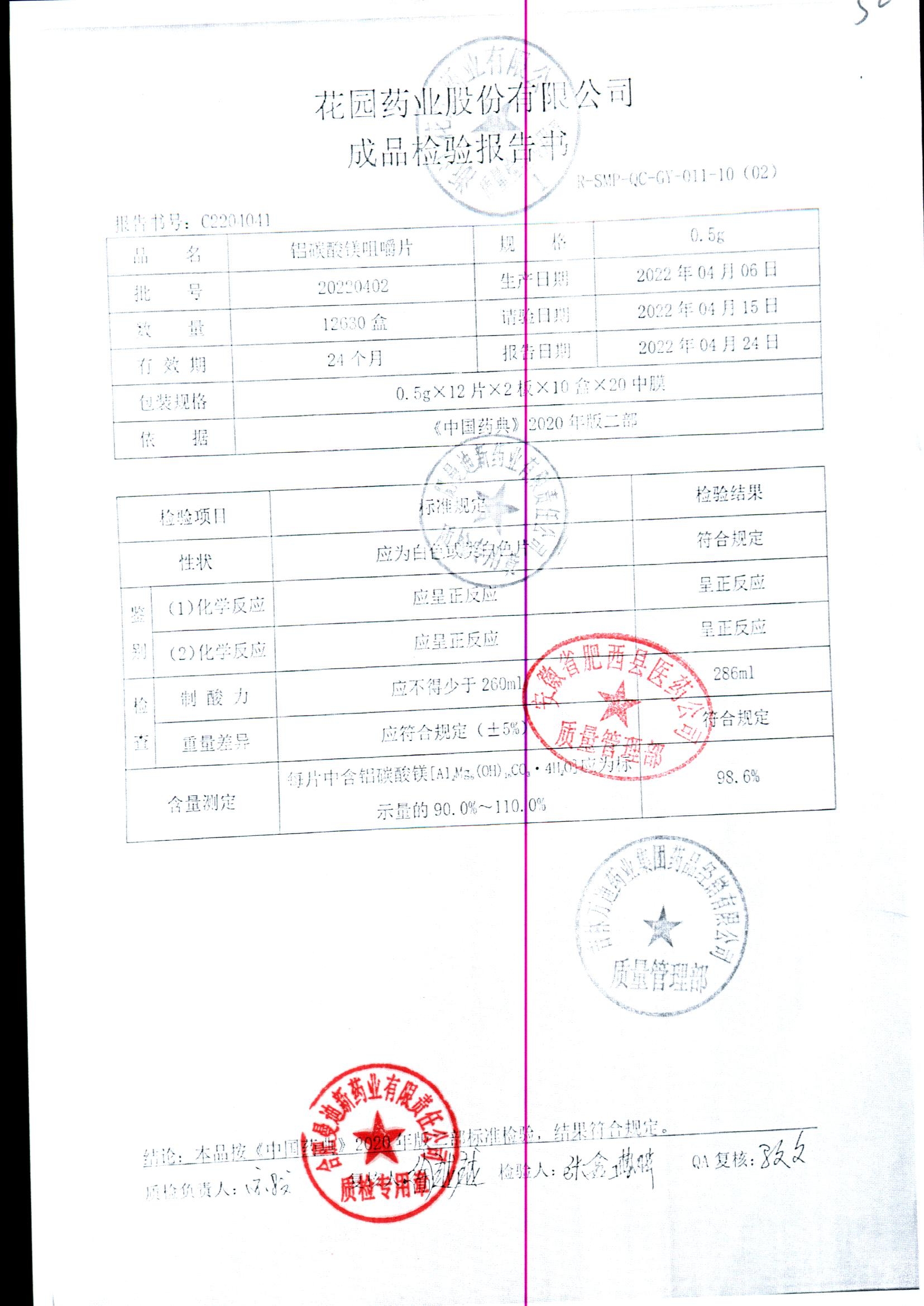 | 铝碳酸镁咀嚼片 | 0.5g*12*2 | 20220402 | 查看详情 |
