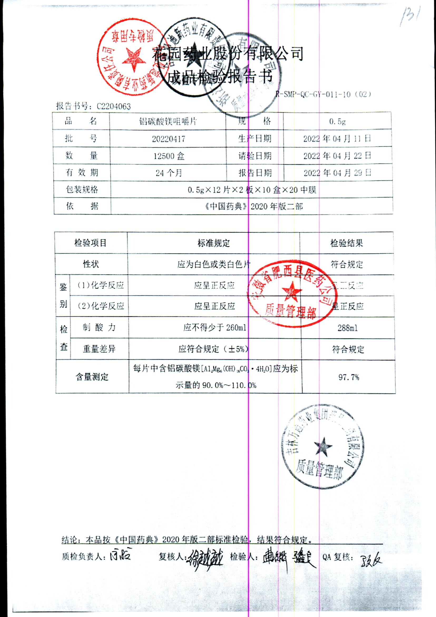 | 铝碳酸镁咀嚼片 | 0.5g*12*2 | 20220417 | 查看详情 |