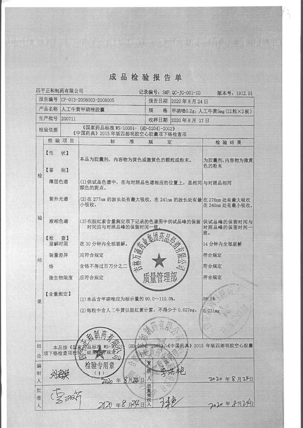 | 人工牛黄甲硝唑胶囊 | 24s | 200908 | 查看详情 |