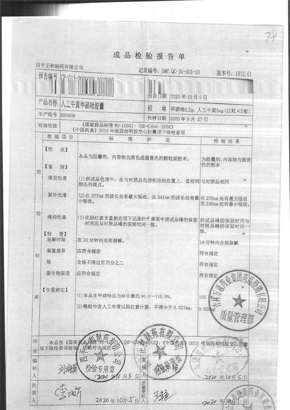 | 人工牛黄甲硝唑胶囊 | 24s | 200903 | 查看详情 |