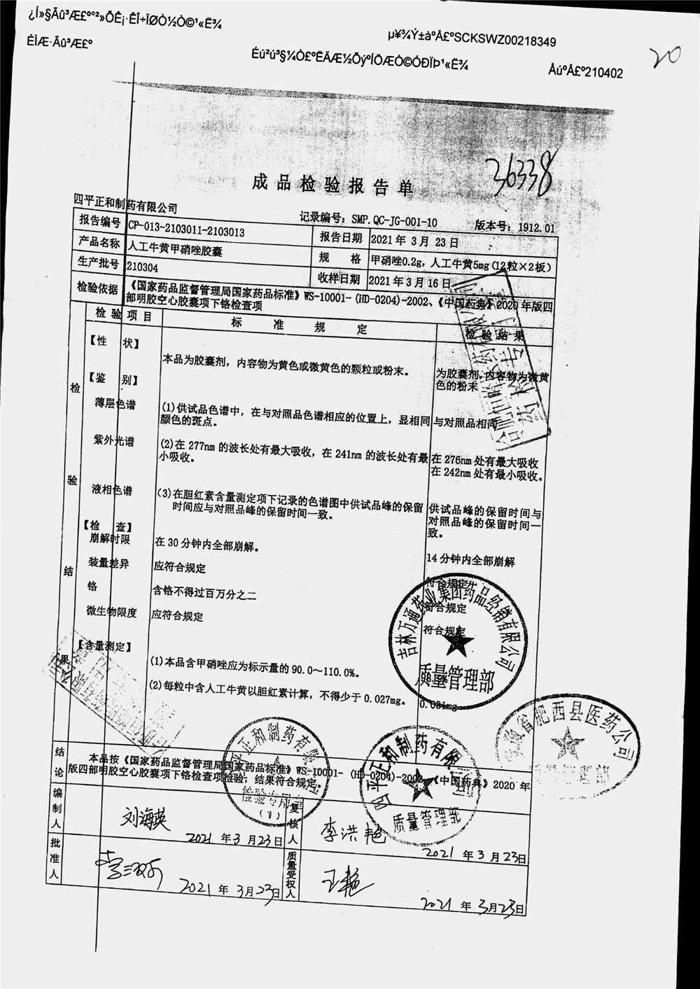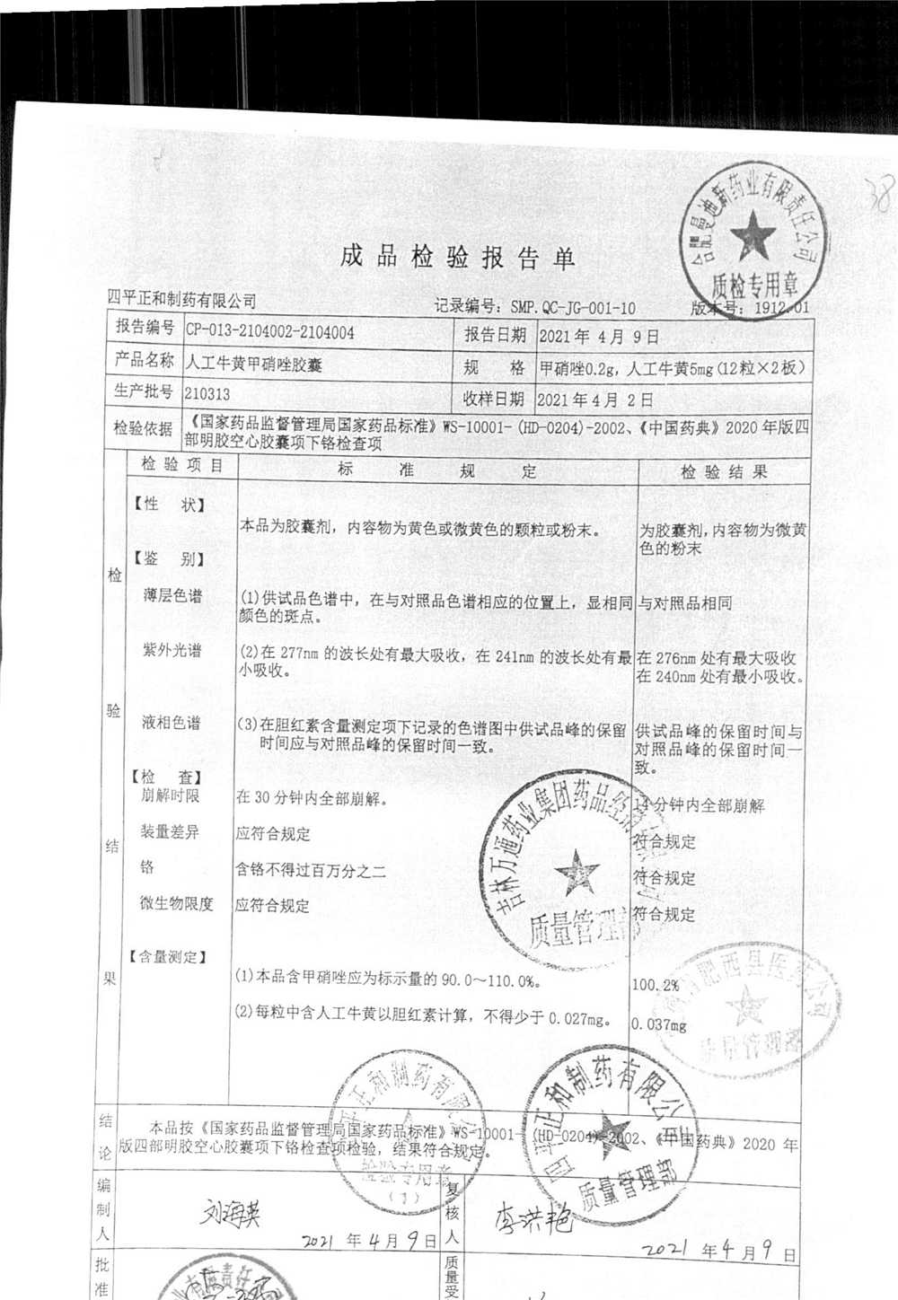 | 人工牛黄甲硝唑胶囊 | 24s | 210313 | 查看详情 |