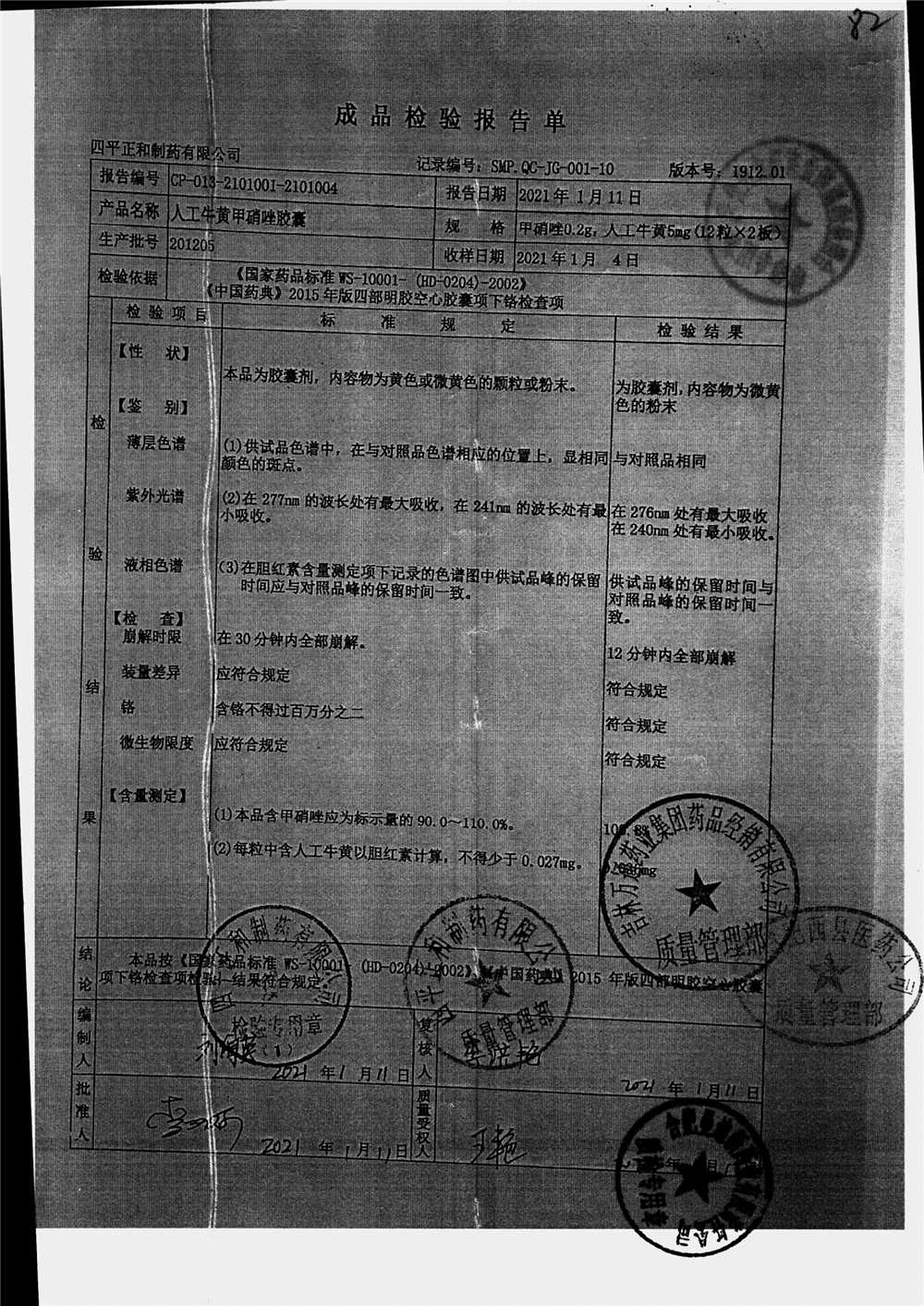 | 人工牛黄甲硝唑胶囊 | 24s | 211201 | 查看详情 |