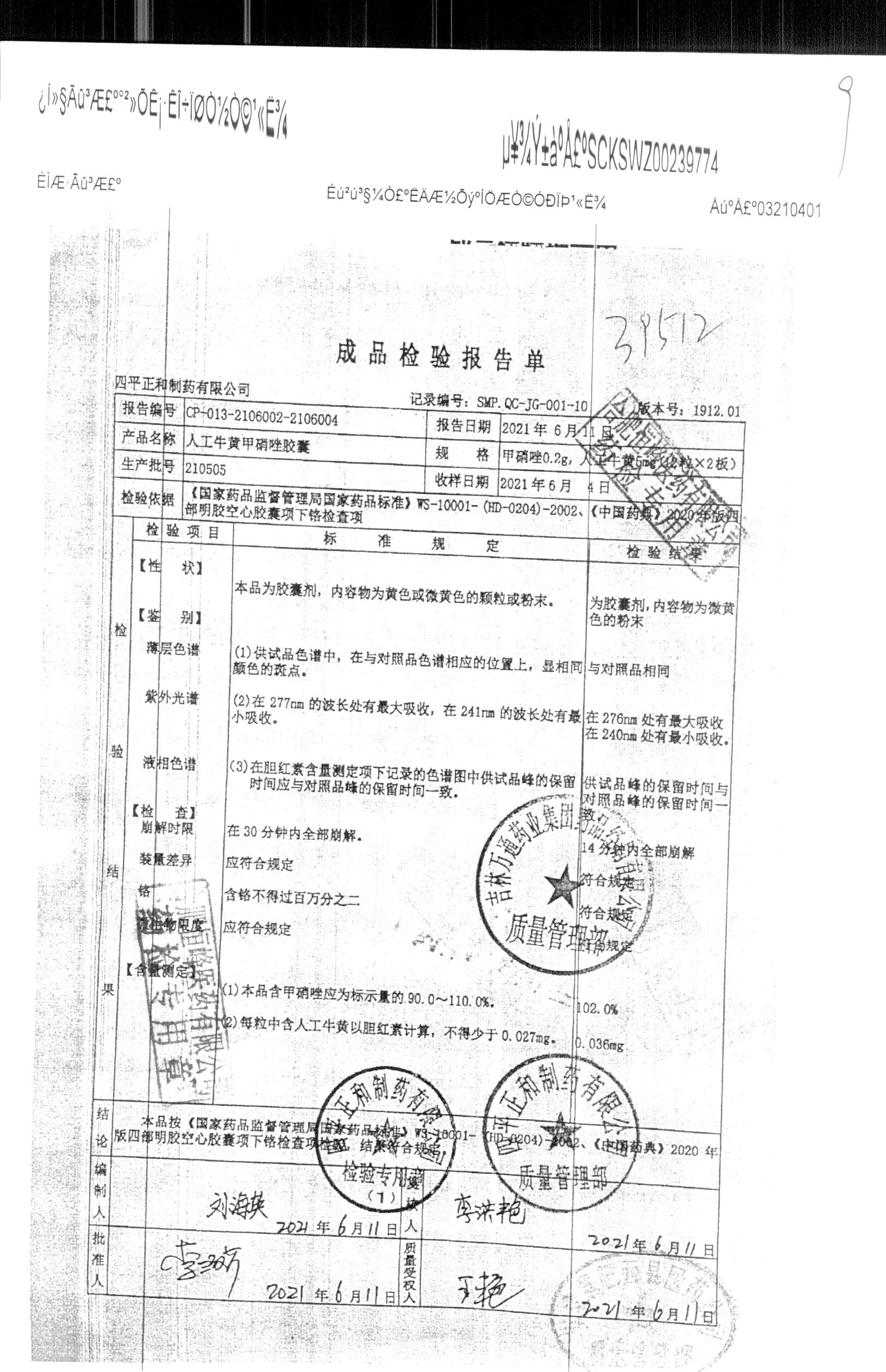 | 人工牛黄甲硝唑胶囊 | 24s | 210505 | 查看详情 |