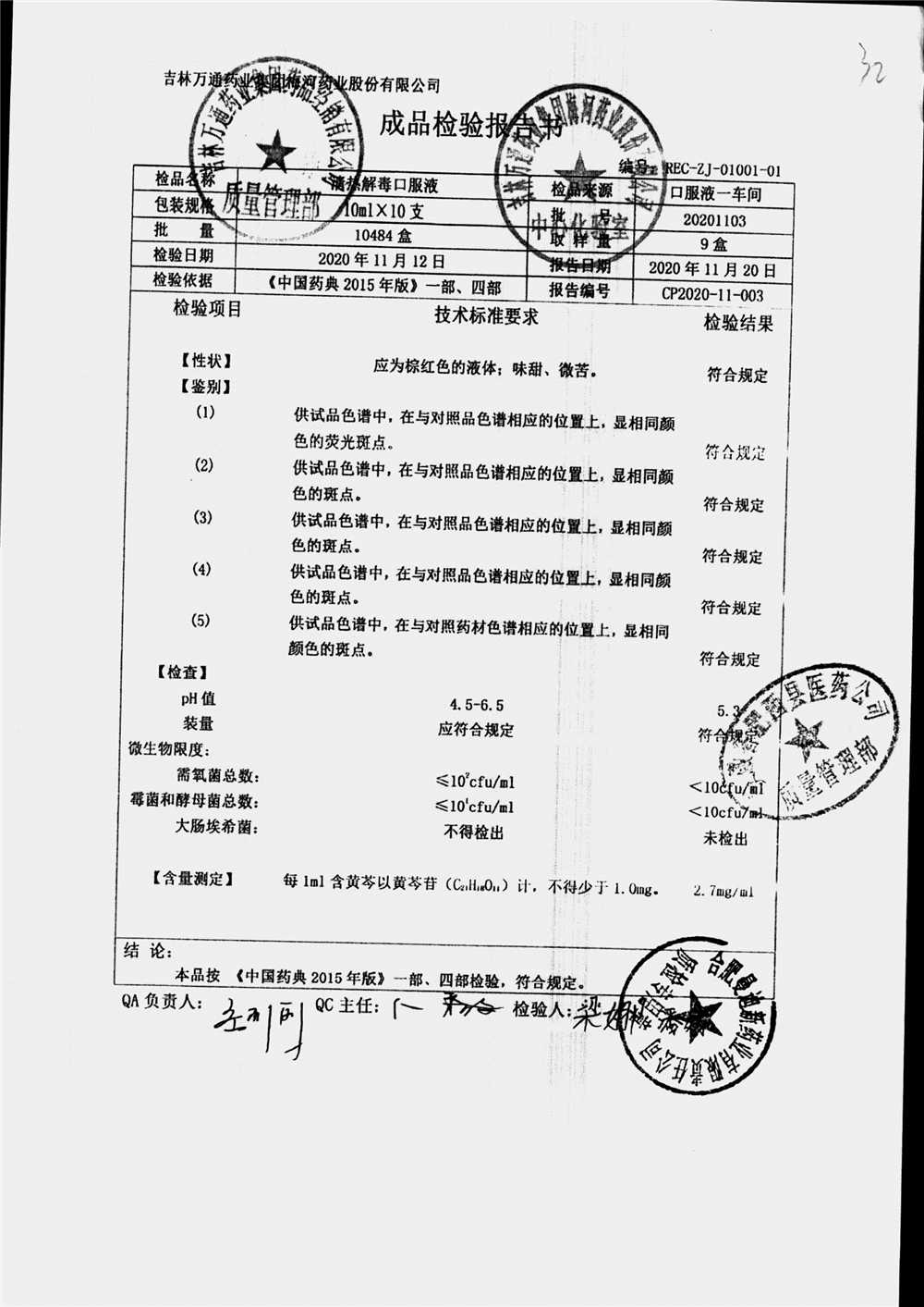 | 清热解毒口服液 | 10ml*10支 | 20201103 | 查看详情 |