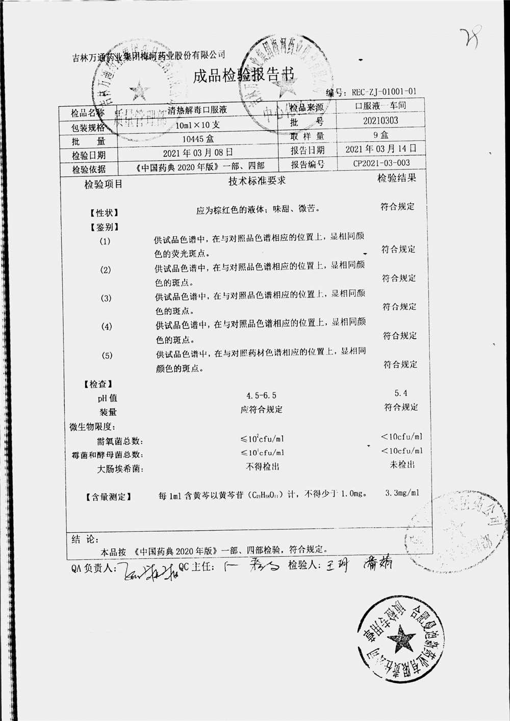 | 清热解毒口服液 | 10ml*10支 | 20210303 | 查看详情 |