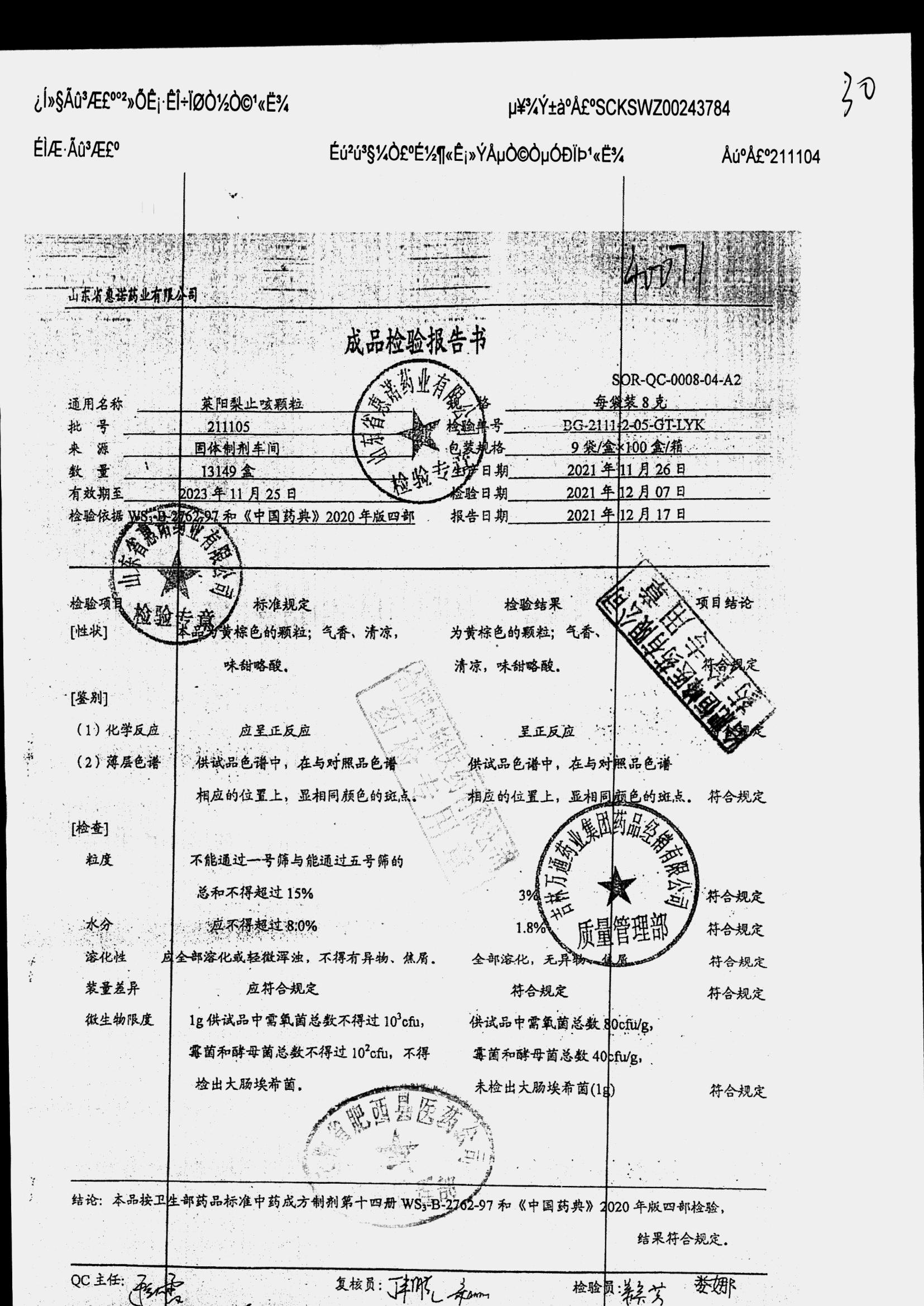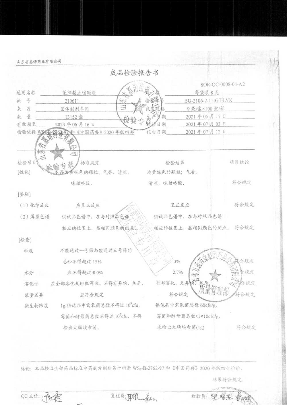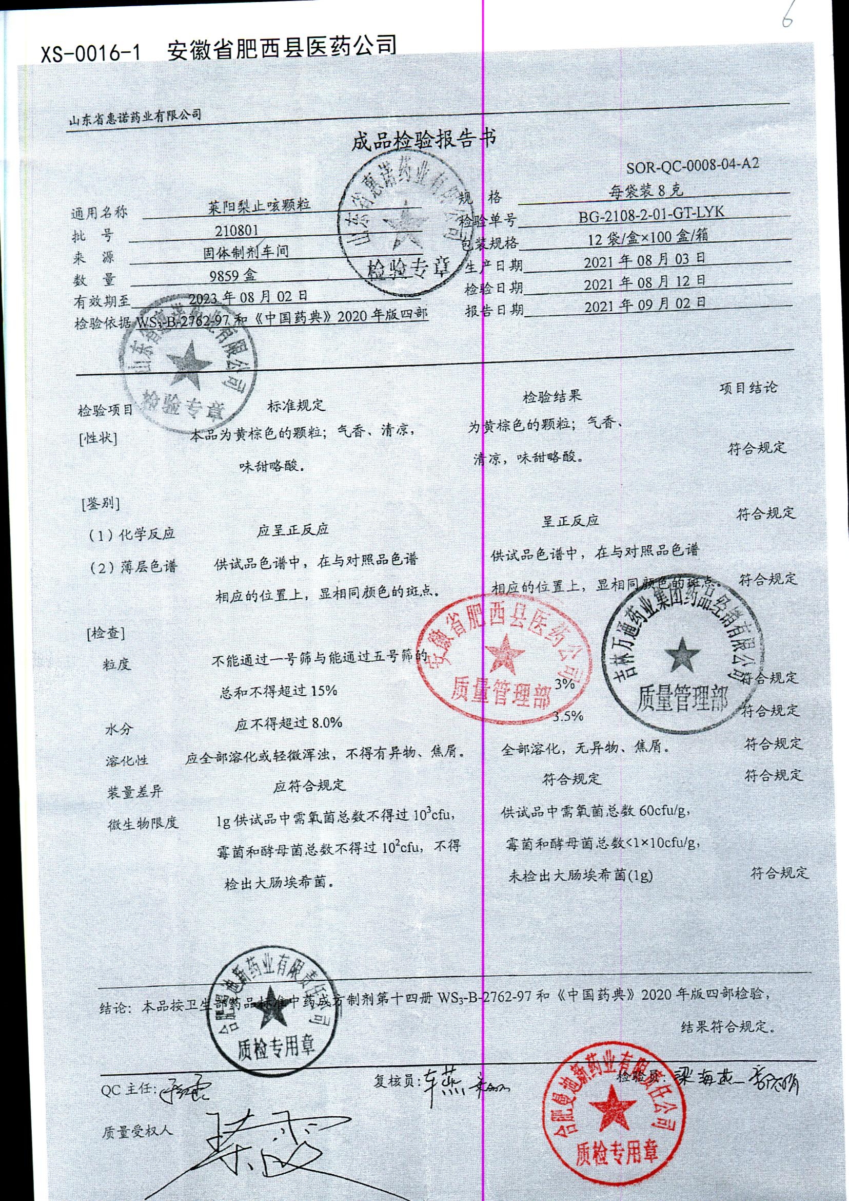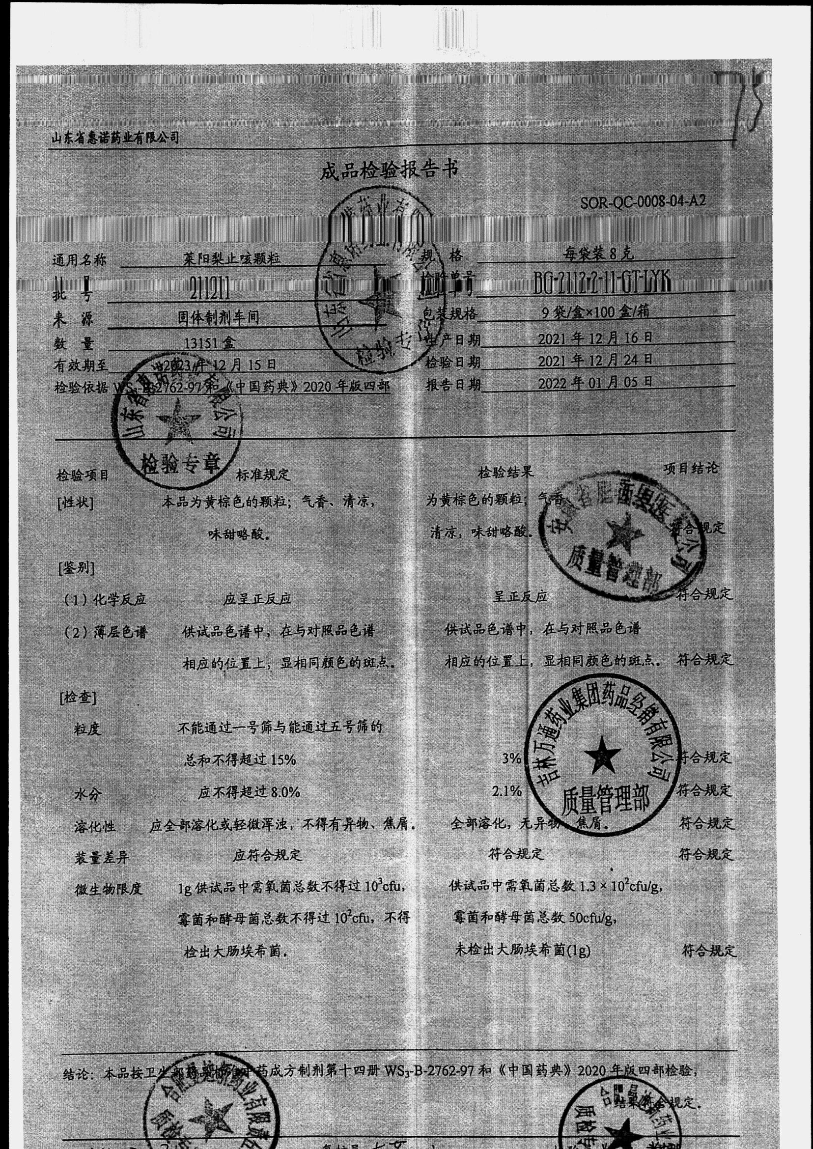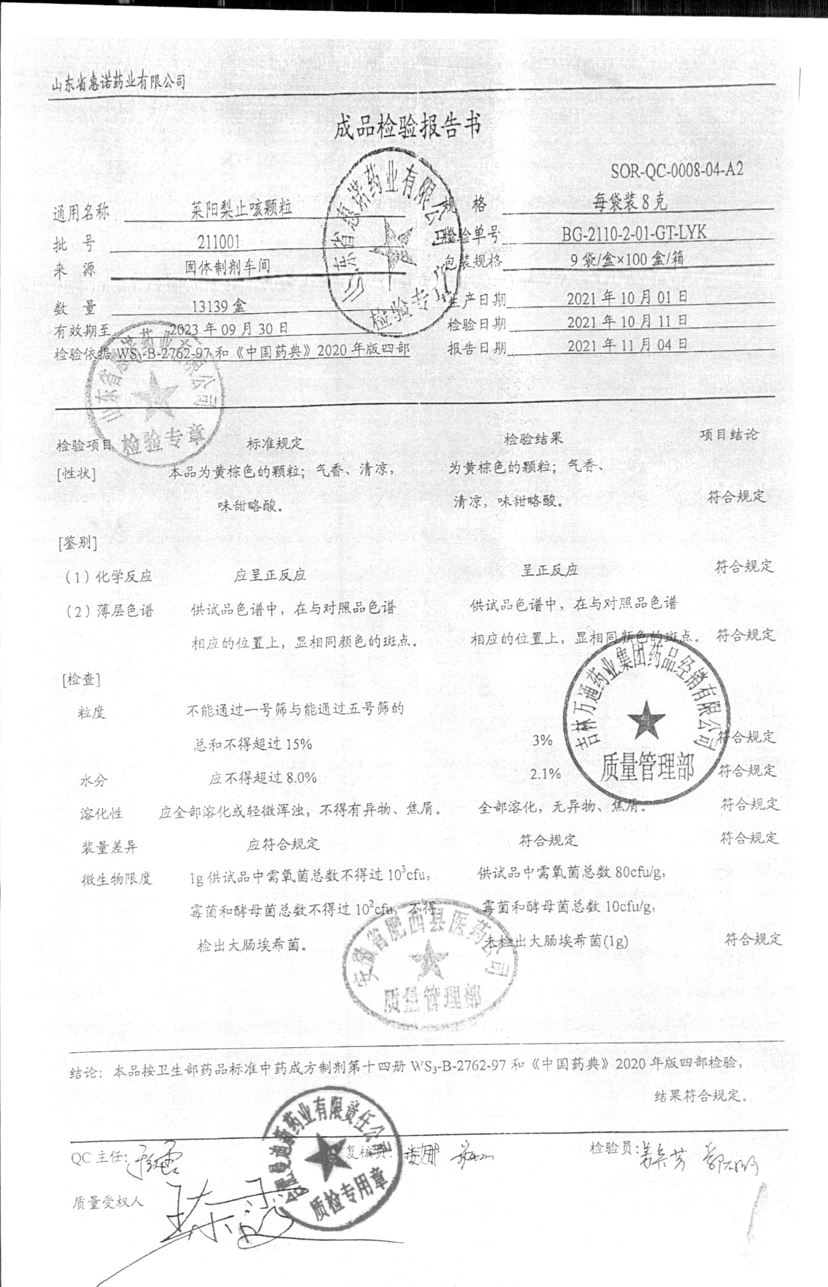 | 莱阳梨止咳颗粒 | 8g | 210801 | 查看详情 |