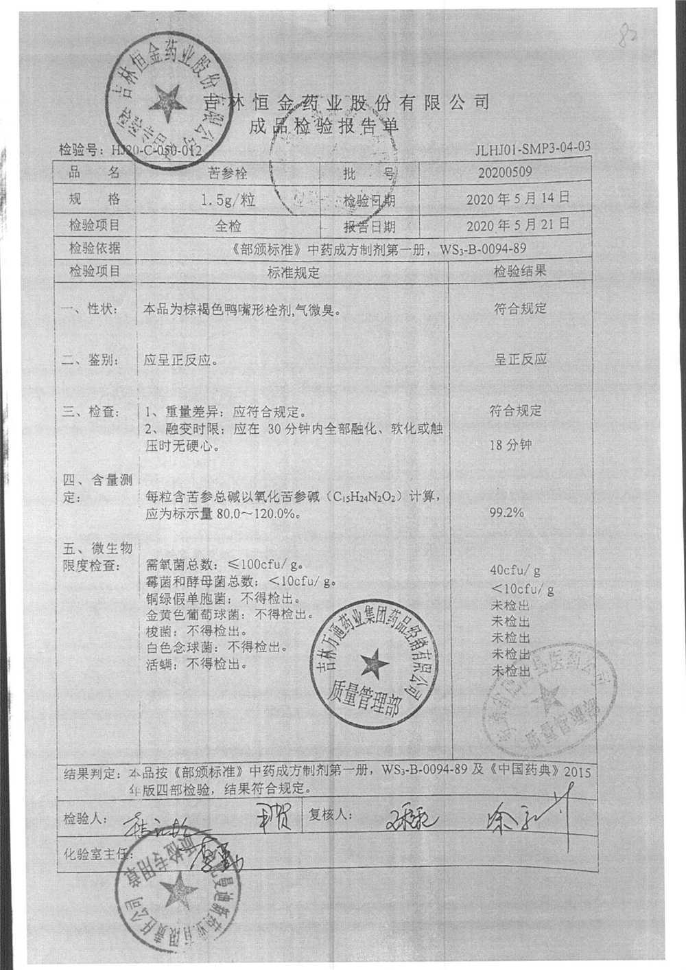 | 苦参栓 | 1.5g*6s | 20200509 | 查看详情 |